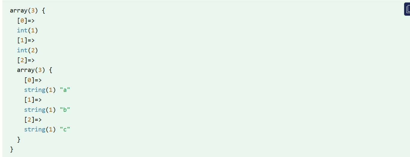 var_dump() 函数显示关于一个或多个表达式的结构信息,包括表达式的类型与值。数组将递归展开值,通过缩进显示其结构。
