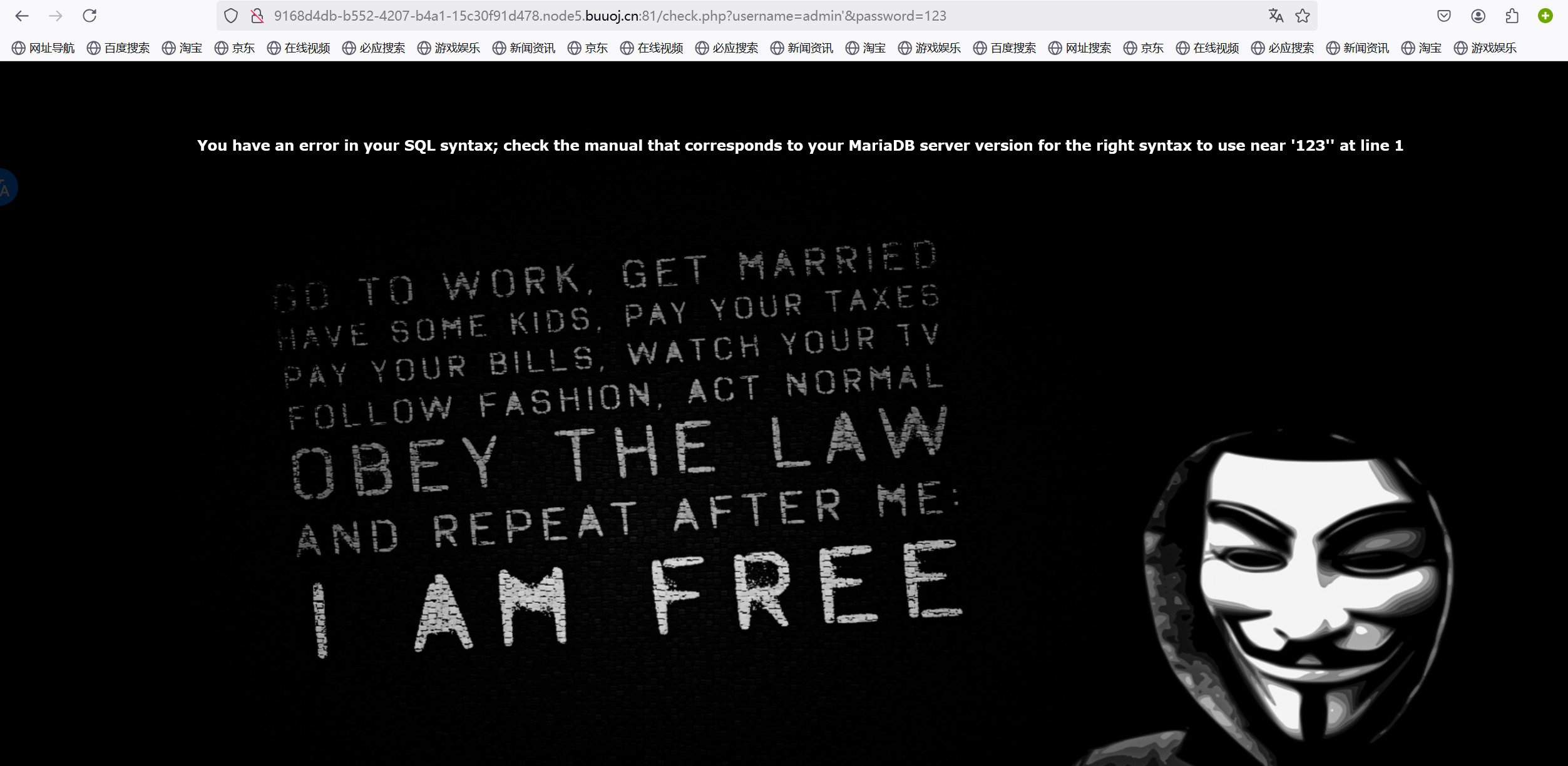原理:在数据库中形成的 sql 语句是 SELECT * FROM table_name WHERE username='admin' and password='123456';使用万能密码并且用#将后面的语句注释掉就行了。