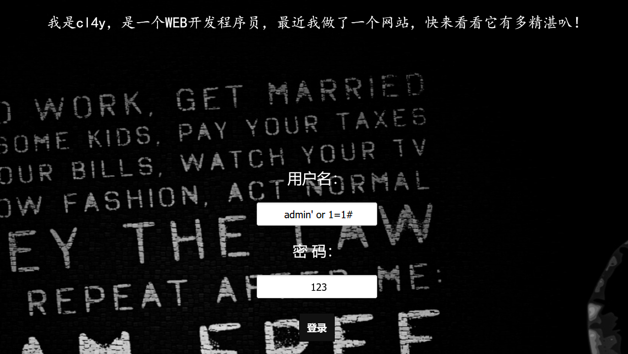 接下来只需要简单的SQL注入语句 admin’ or 1=1就可以得到flag