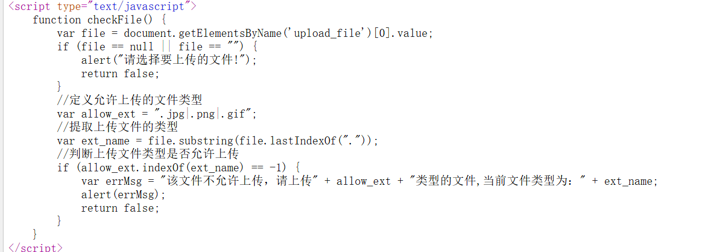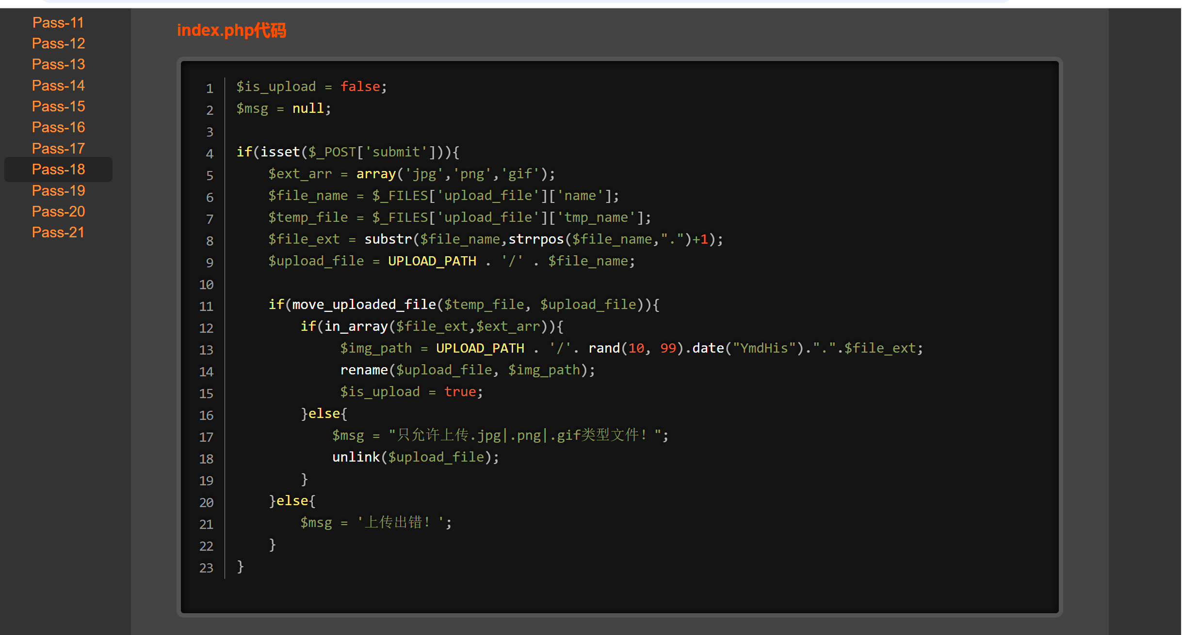 源码分析:服务器先是将上传的文件保存下来,然后将文件的后缀名同白名单对比,如果是jpg、png、gif中的一种,就将文件进行重命名。如果不符合的话,unlink()函数就会删除该文件。