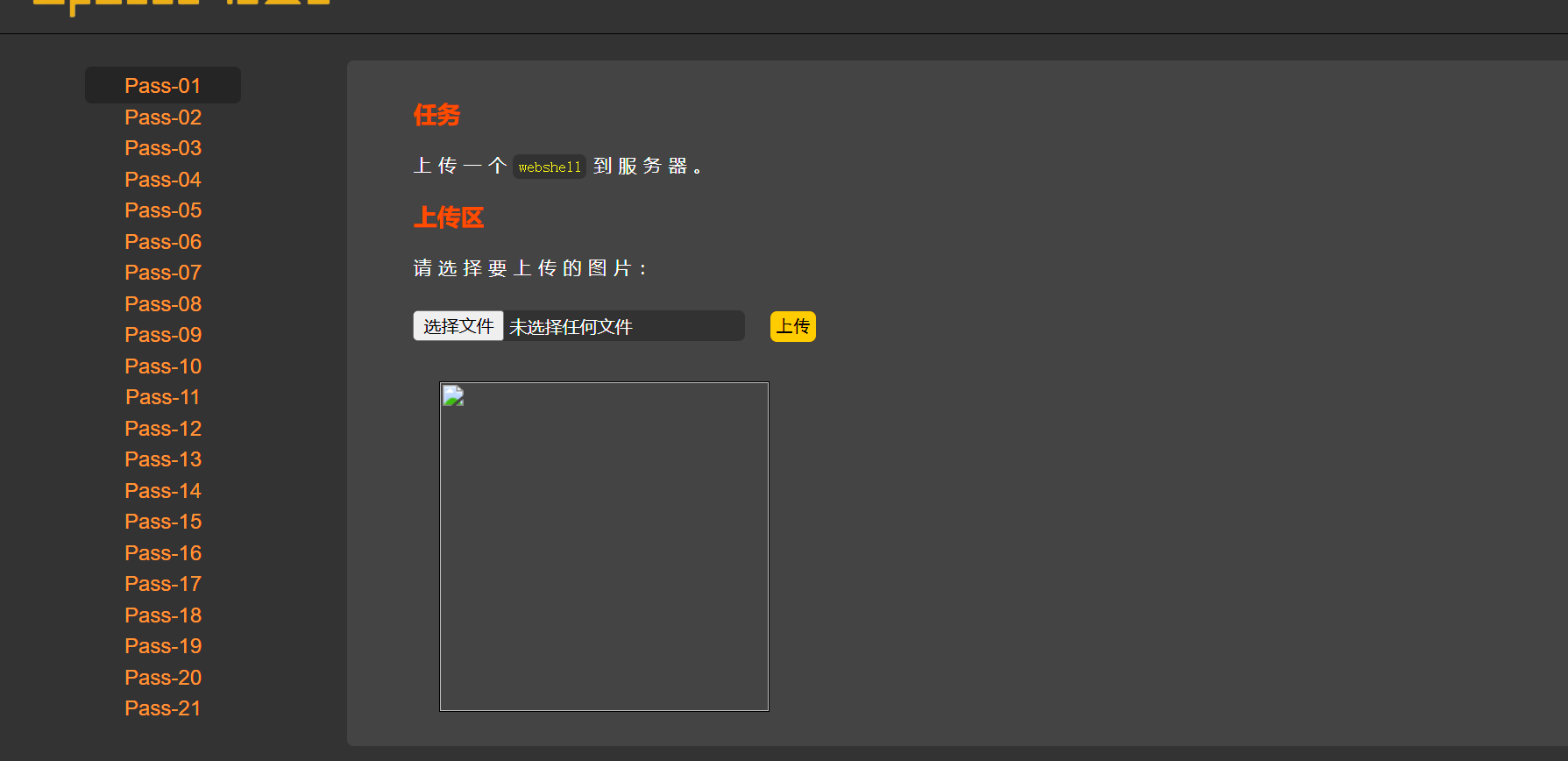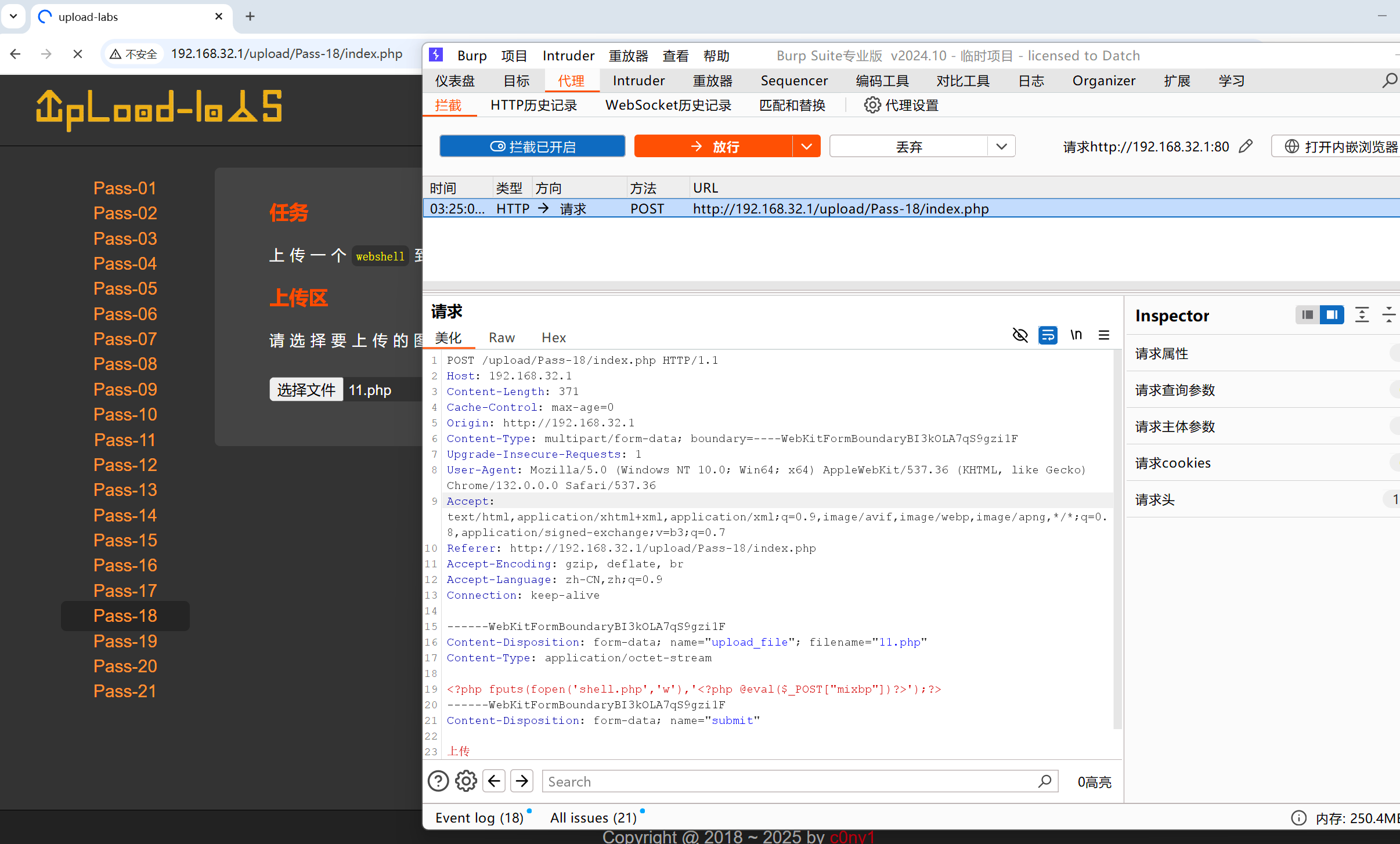 原理:如果这里有文件包含漏洞的话我们就能用前几关的图片马来绕过,但是这关没有,所以我们只能上传一个能够生成一句话木马的语句然后在这个语句被删除之前访问他(不能直接上传一句话木马访问,会被删除),利用burp多线程发包,然后不断在浏览器访问我们的shell,如果访问成功就会生成一句话木马