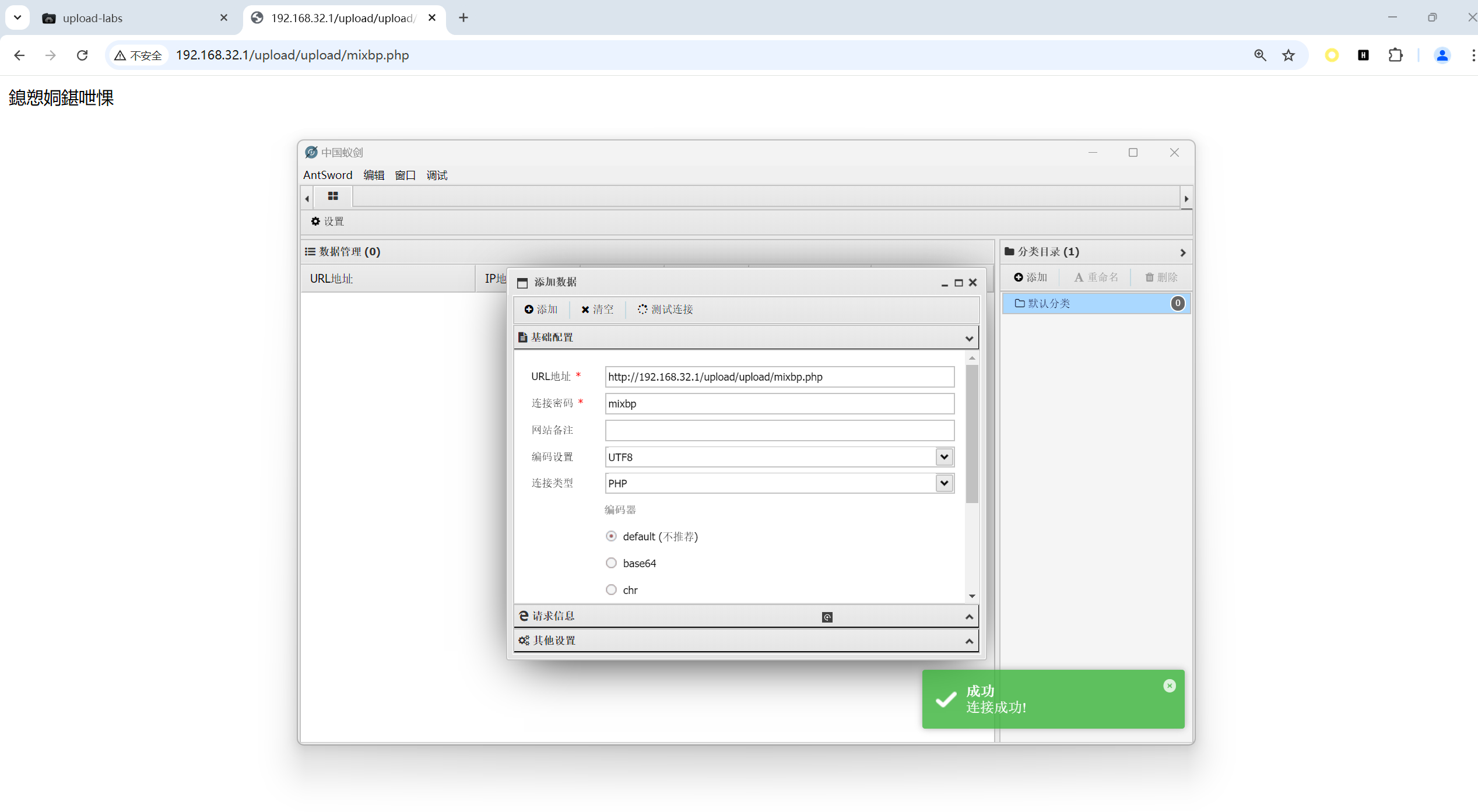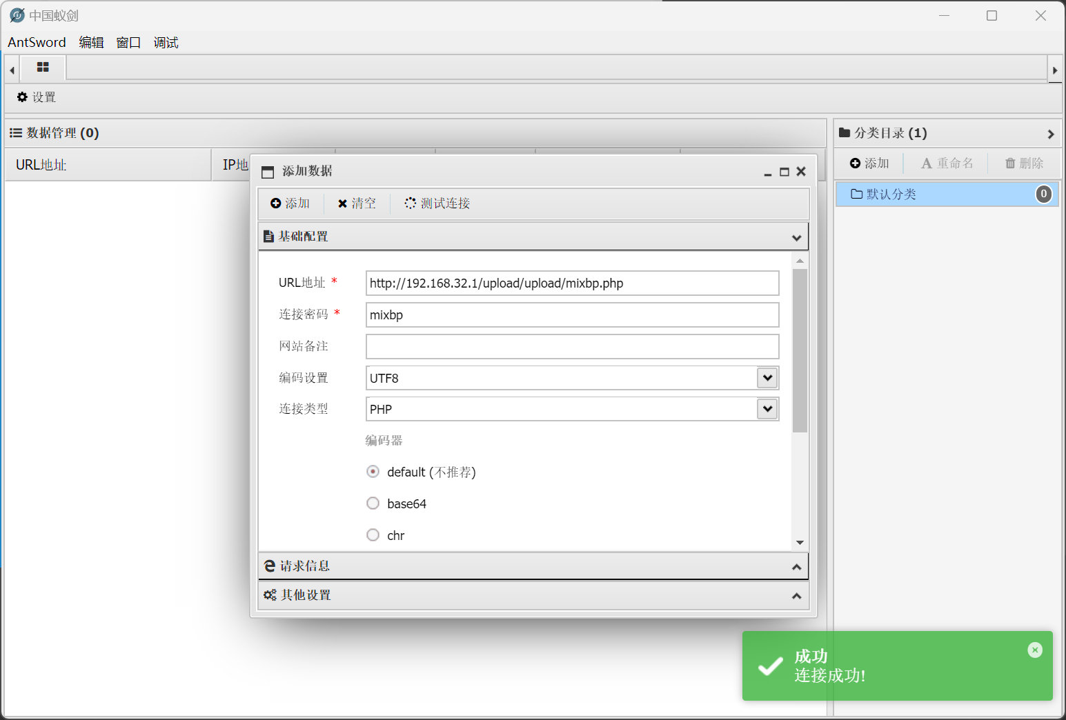 右键复制图片链接并在蚁剑中测试连接出现连接成功