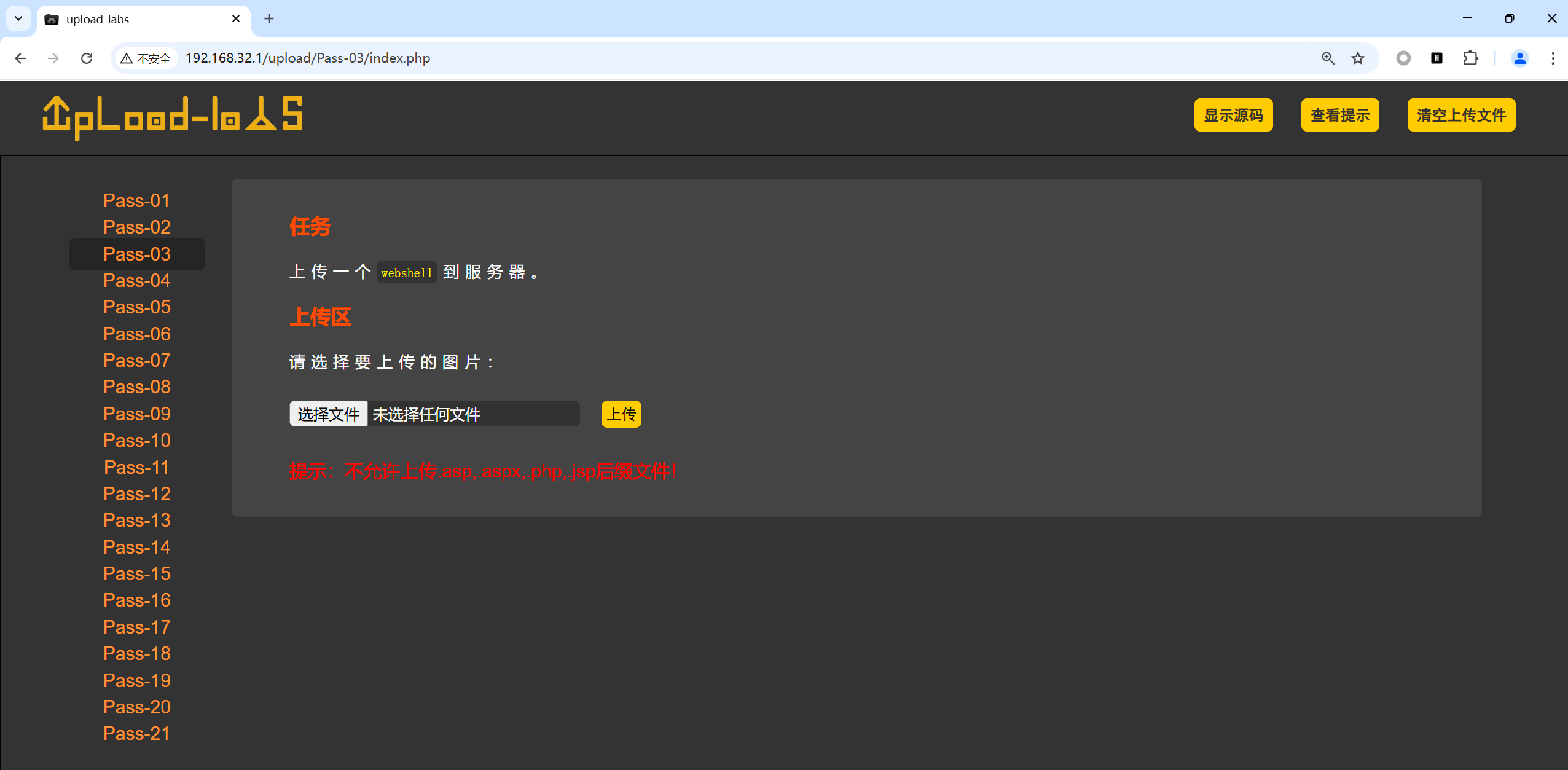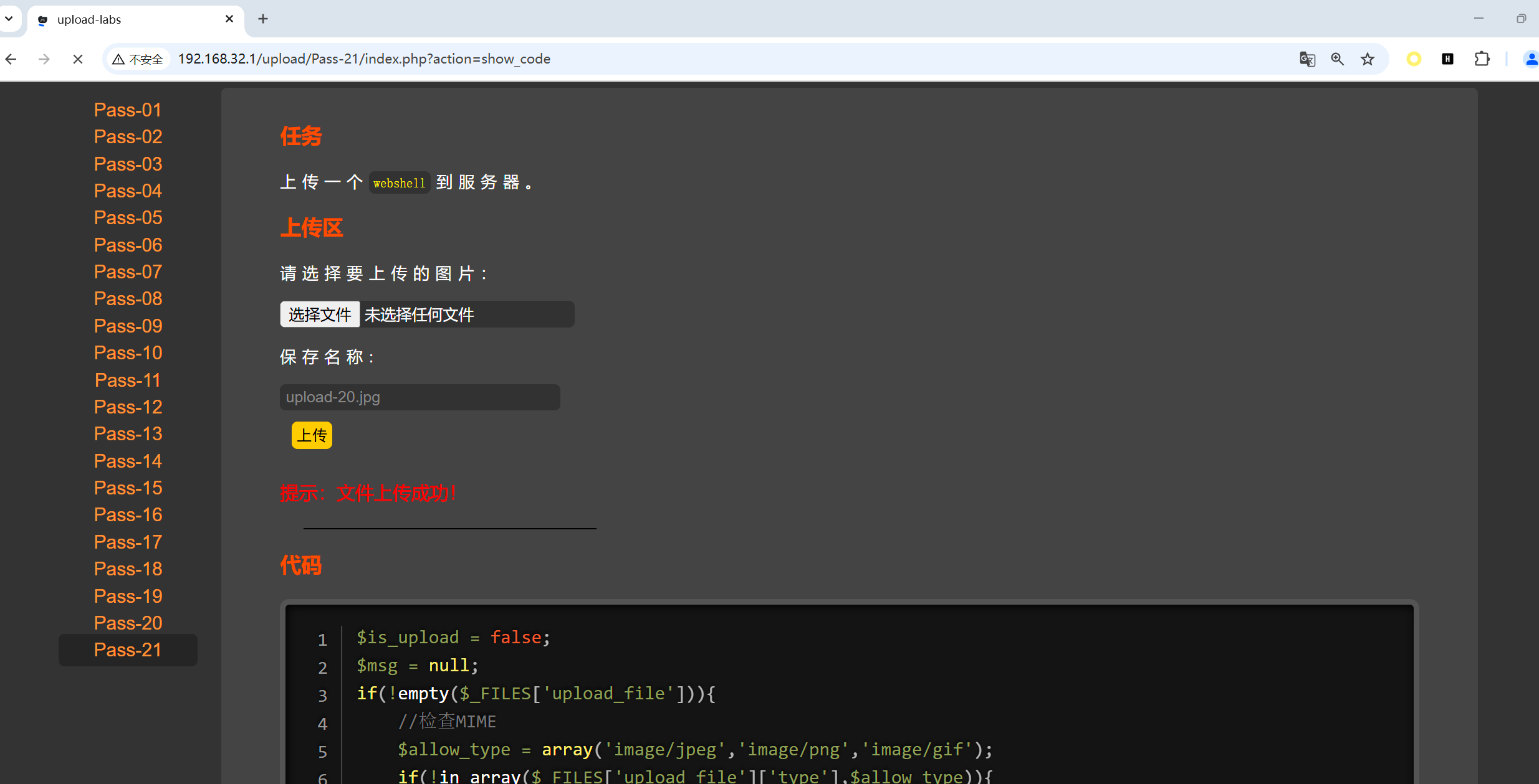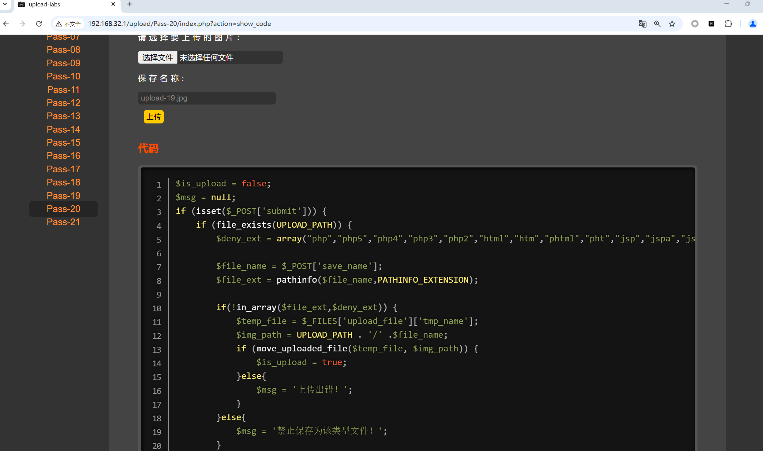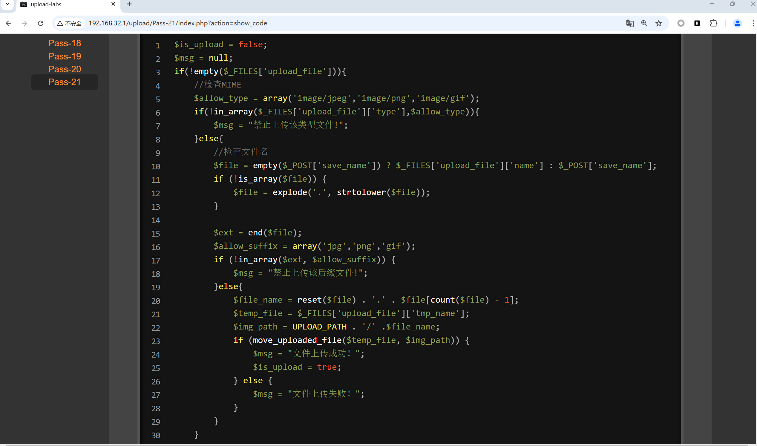 源码分析:这关会将保存名称最后一个点之后的内容当做后缀名并验证,所以前面的所有后缀绕过都行,相当于前面后缀绕过的总结