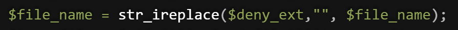 原理:这个函数会从左到右检查$file_name如果其中存在$deny_ext数组中(黑名单)的后缀,会被替换为空值””,但是只替换一次,所以只要将后缀改为.pphphp即可