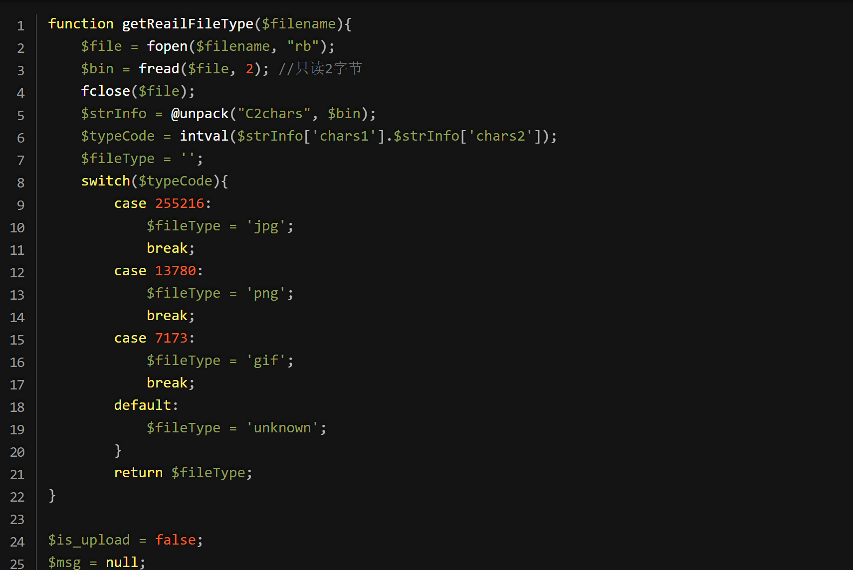 原理:查看源码发现使用了getimagesize()函数和image_type_to_mime_type()函数,先将图像信息取出,然后将取出的图像类型常量值转换为MIME类型,从而验证文件类型。所以这里我们不能用字节标识绕过,但是可以用图片马绕过