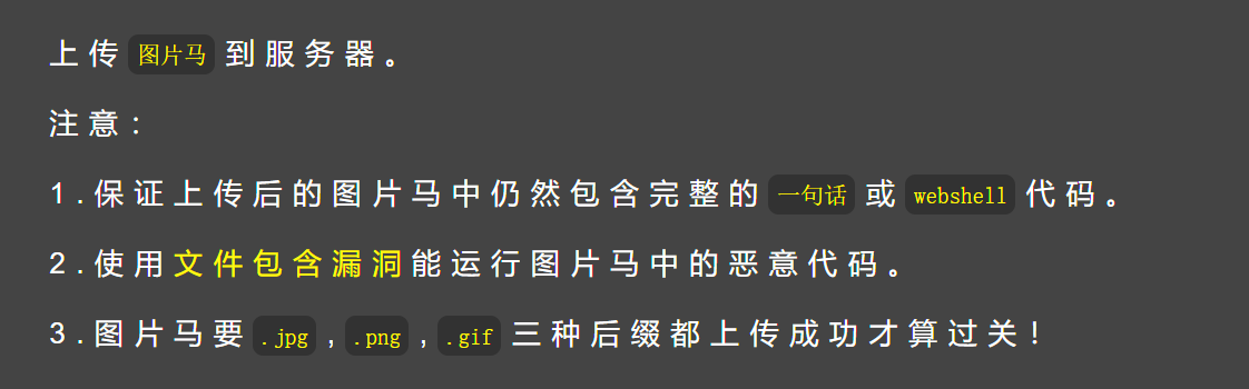 查看源码发现这关检查了content-type和后缀,并且用imagecreatefromjpeg,imagecreatefrompng,imagecreatefromgif函数判断上传的是否为这三种类型的文件,并且使用了二次渲染,导致我们普通的图片马会被渲染,导致失效。