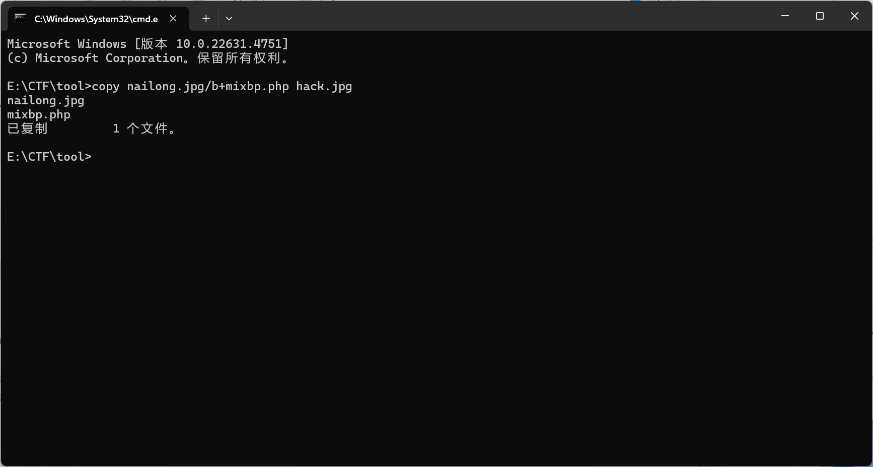 将我们的php一句话木马拷进nailong.jpg中,最后生成出来一个hack.jpg图片里面就含有我们的一句话木马