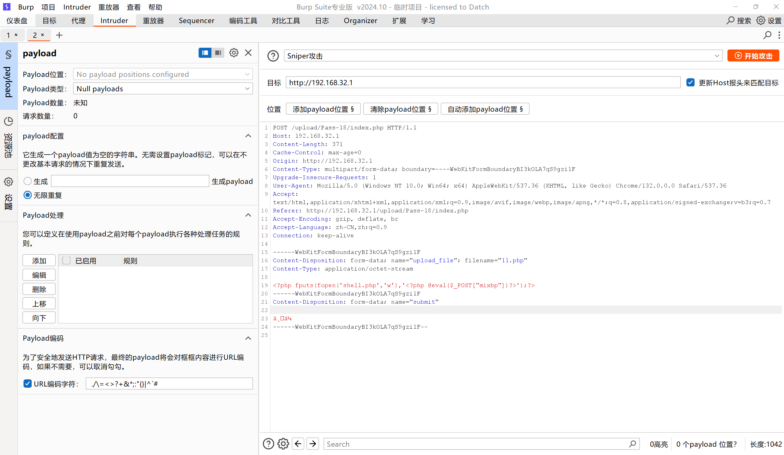 这里不使用python脚本也行,我们访问http://192.168.32.1/upload/upload/11.php路径然后抓取访问包,然后将访问包设置攻击,也是选择null payloads然后选择无限重复,调高线程成功访问概率会更大。然后就是先开启上传攻击,然后再访问攻击即可