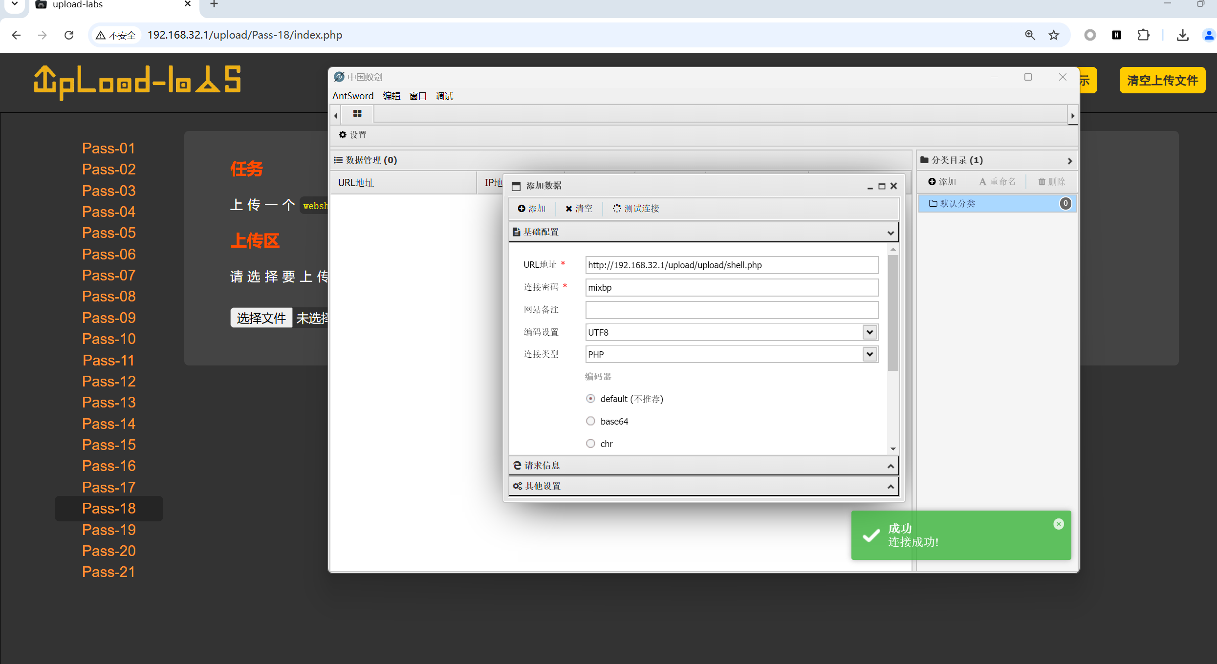 然后放包上传成功就能复制图片链接用蚁剑连接了,后面的步骤和上关一样