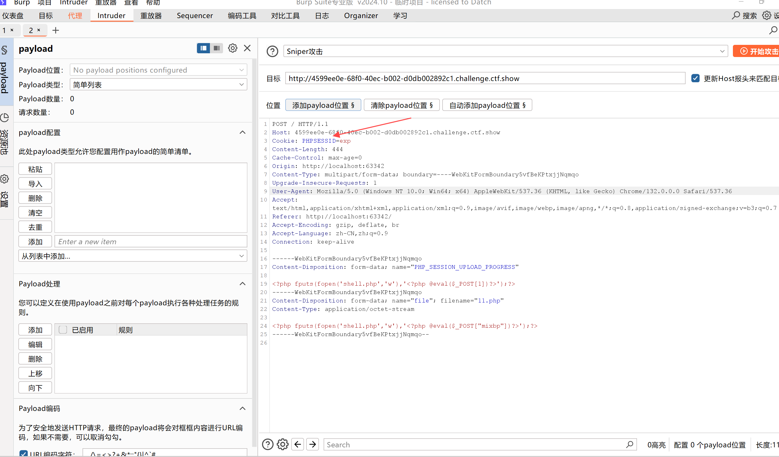 抓包之后放到攻击模块,然后在Cookie:添加PHPSESSID=exp(自定义),如果没有Cookie自行添加