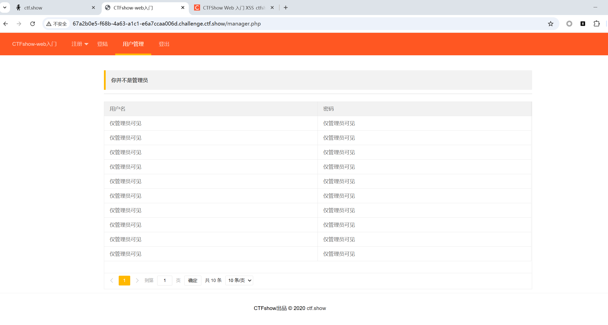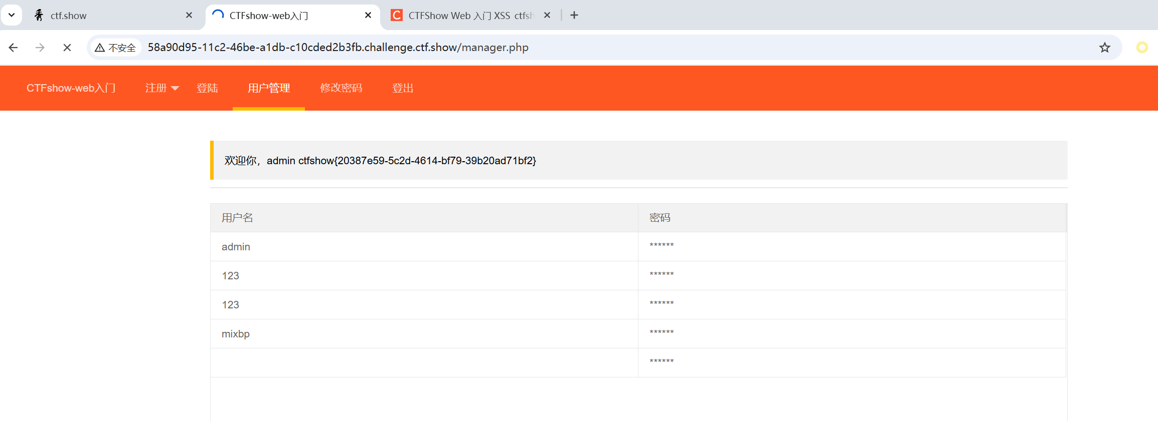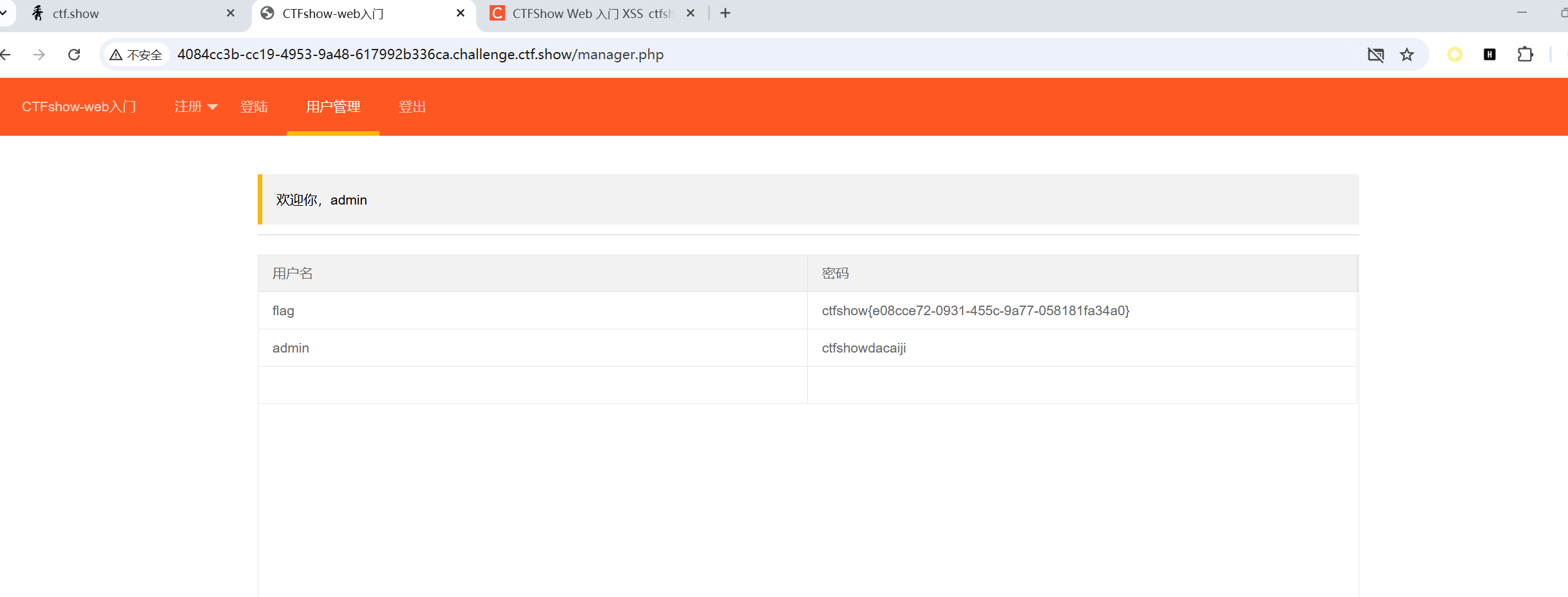 发现有一个用户管理页面,只有管理员可见,管理员可以用它看到所有用户的用户名和密码,所以这里就存在存储型的xss漏洞。