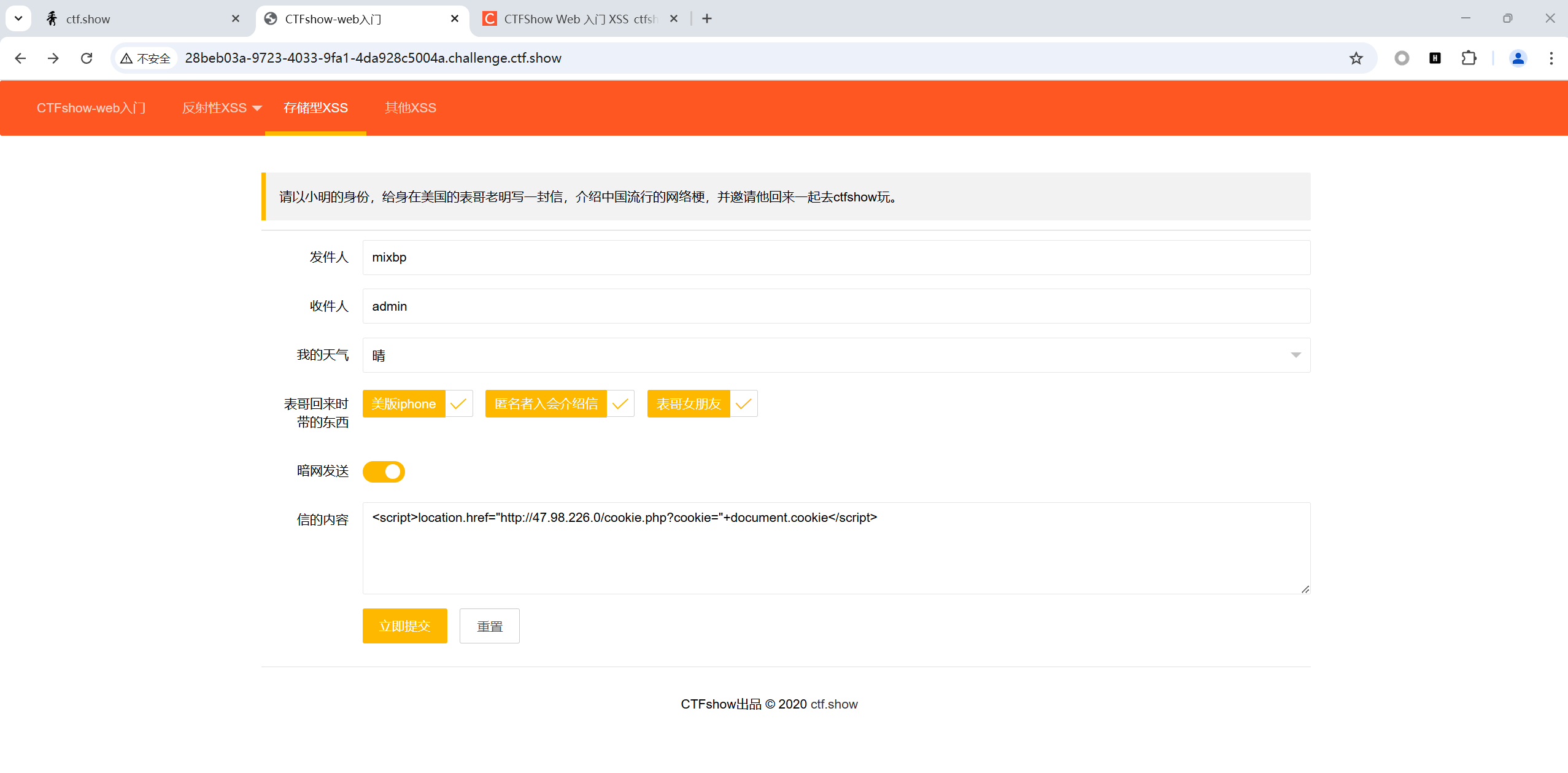 要接收管理员的cookie,所以收件人需要是admin才能发送成功
