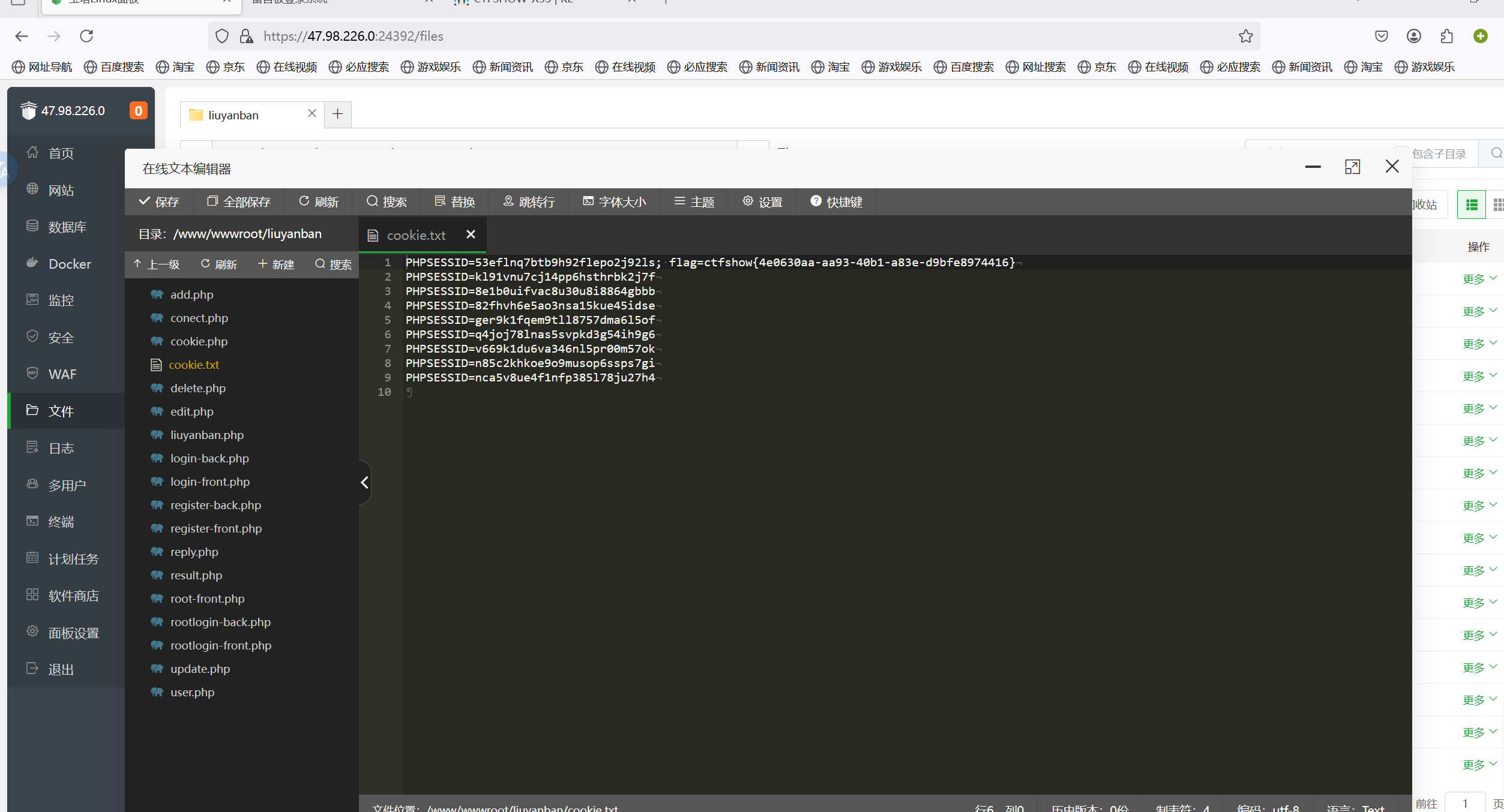当这行代码提交后会有类似admin管理员的程序每隔一段时间就查看我们提交的连接,然后就可以拿到admin的cookie,我们服务器端目录内就会生成cookie.txt,flag就在里面