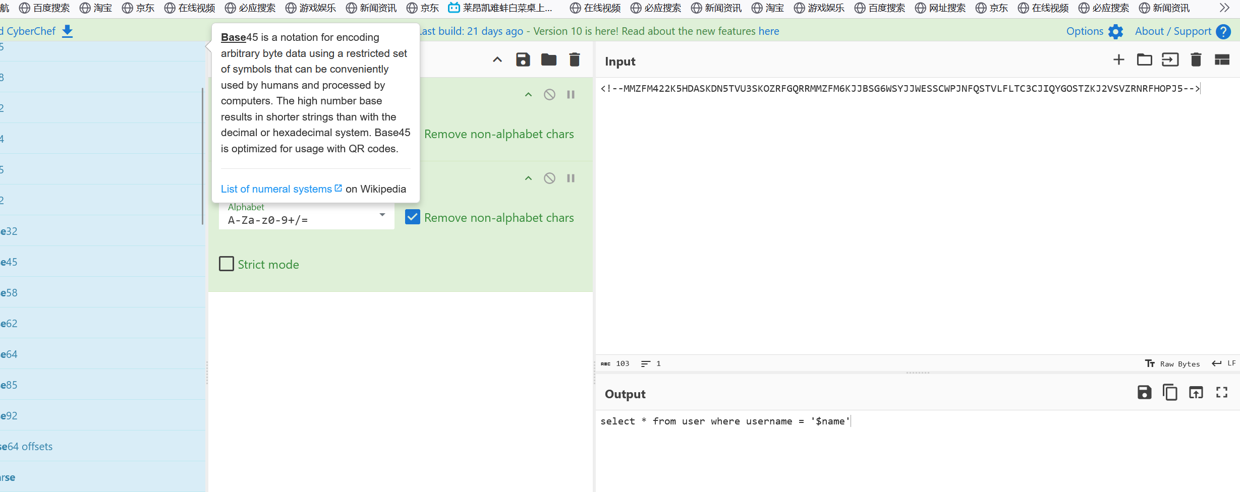 3、搞了半天没搞懂这是啥加密,结果查了一下我说是base32+base64混合加密。所以我们需要先进行base32解码再进行base64解码,最后就得到了一段sql语句