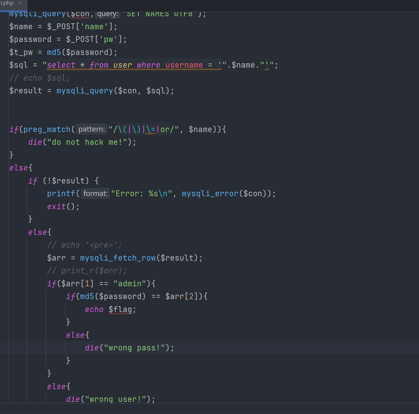 | if(preg_match("/\(|\)|\=|or/", $name)){ die("do not hack me!"); } else{ if (!$result) { printf("Error: %s\n", mysqli_error($con)); exit(); } else{ // echo '<pre>'; $arr = mysqli_fetch_row($result); // print_r($arr); if($arr[1] == "admin"){ if(md5($password) == $arr[2]){ echo $flag; } else{ die("wrong pass!"); } } else{ die("wrong user!"); } } }