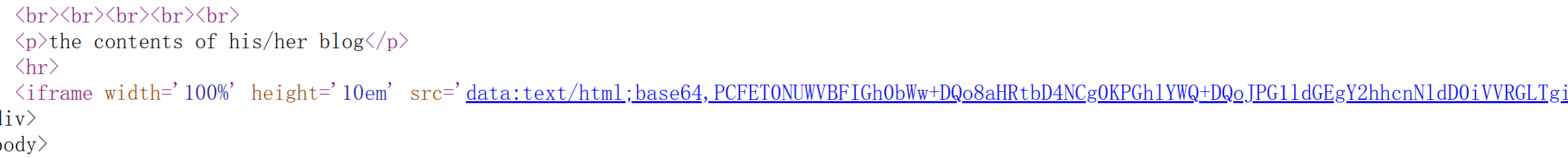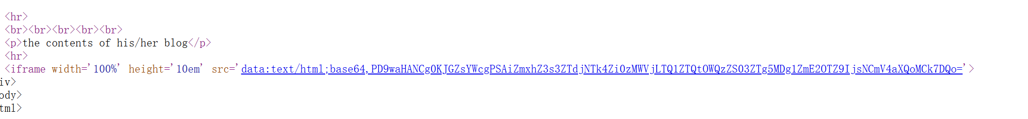 说明这里blog地址,age等数据是通过php反序列化得到并回显到页面上,并且回显位即数据位就是4所在的位置,所以我们可以构造反序列化字符串。通过file伪协议去读取/var/www/html/flag.php路径下的flag.php,然后iframe标签就会去读取文件并且base64编码