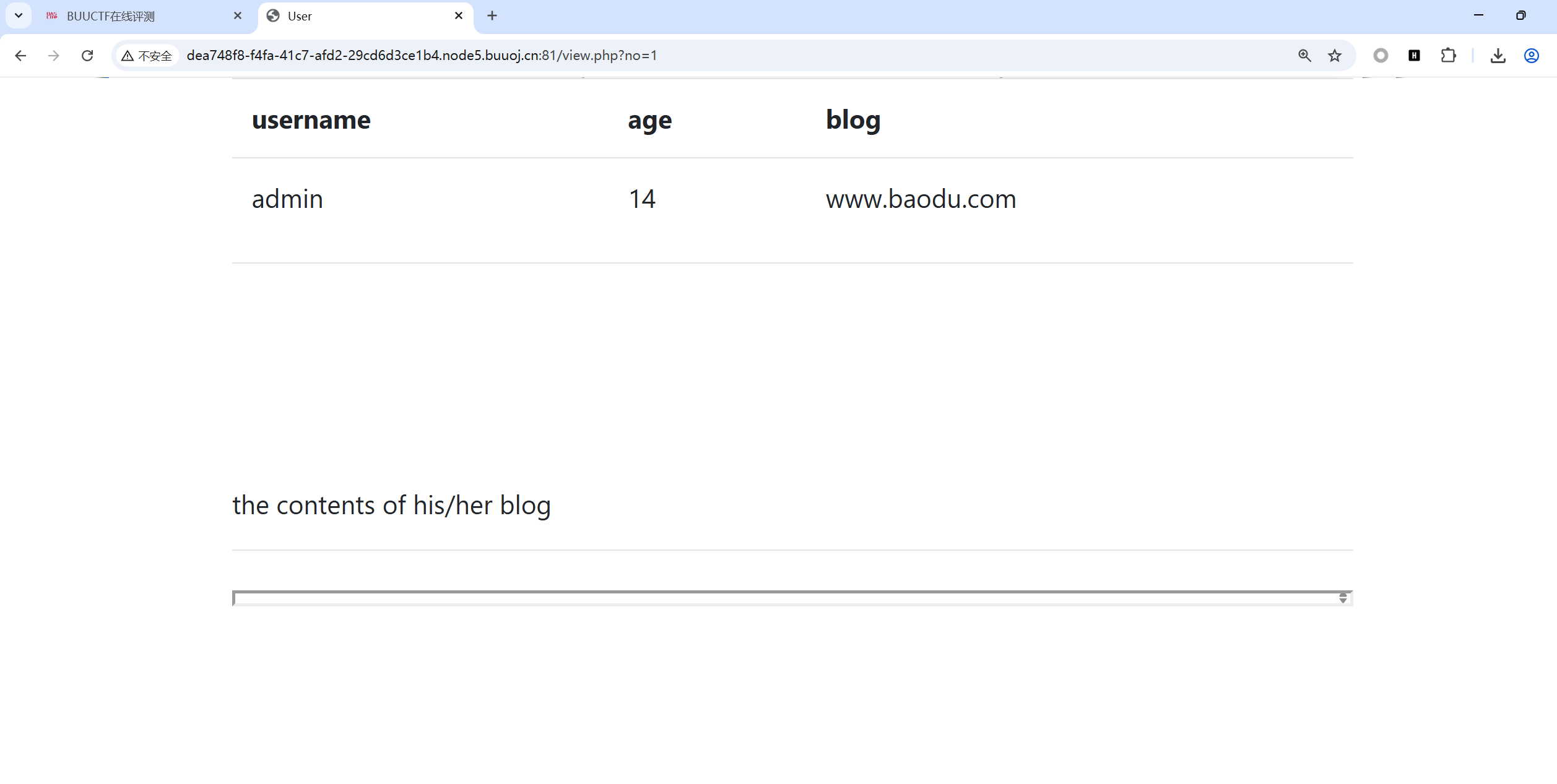 7、看到url中有个get传参view.php?no=1,猜测这里的用户数据应该是从数据库查询出来回显的,所以我们测试一下