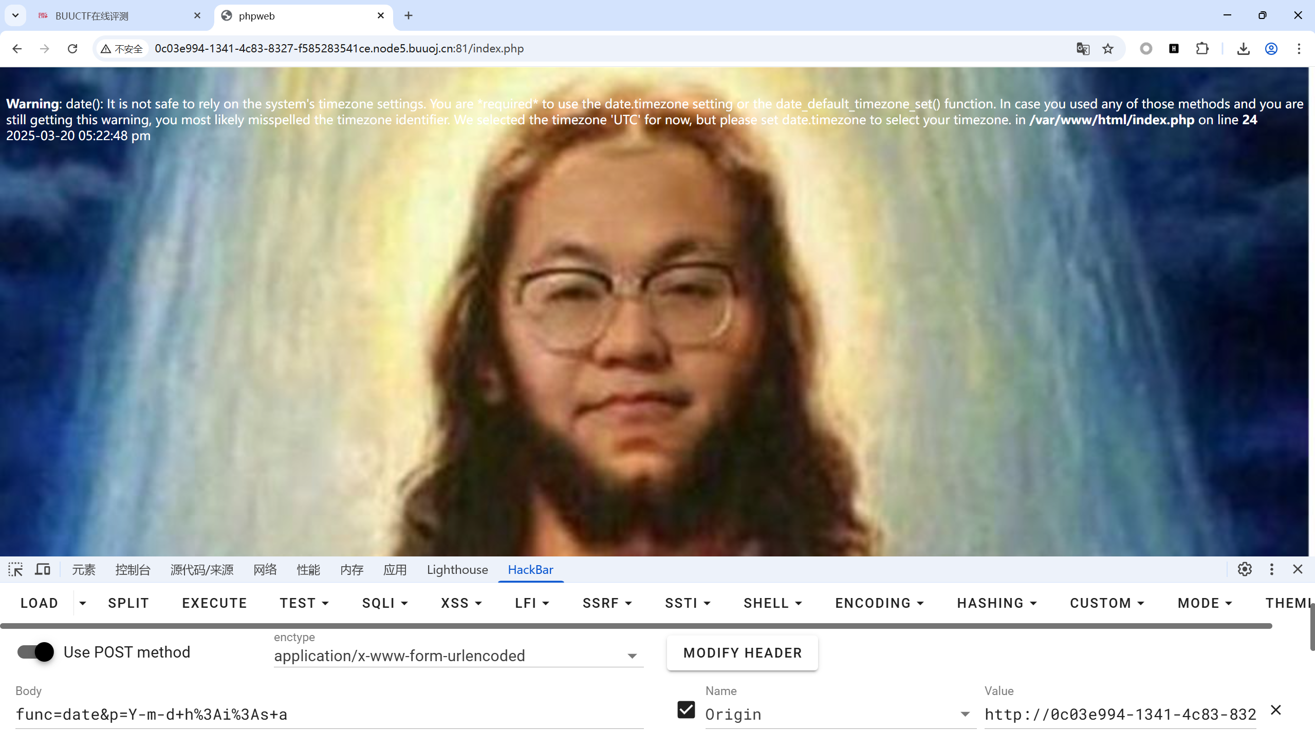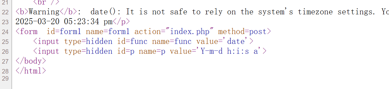 2、最上面一行报错让我们用date_default_timezone_set()函数改时区,然后查看源码发现这里有个post方法提交的隐藏表单