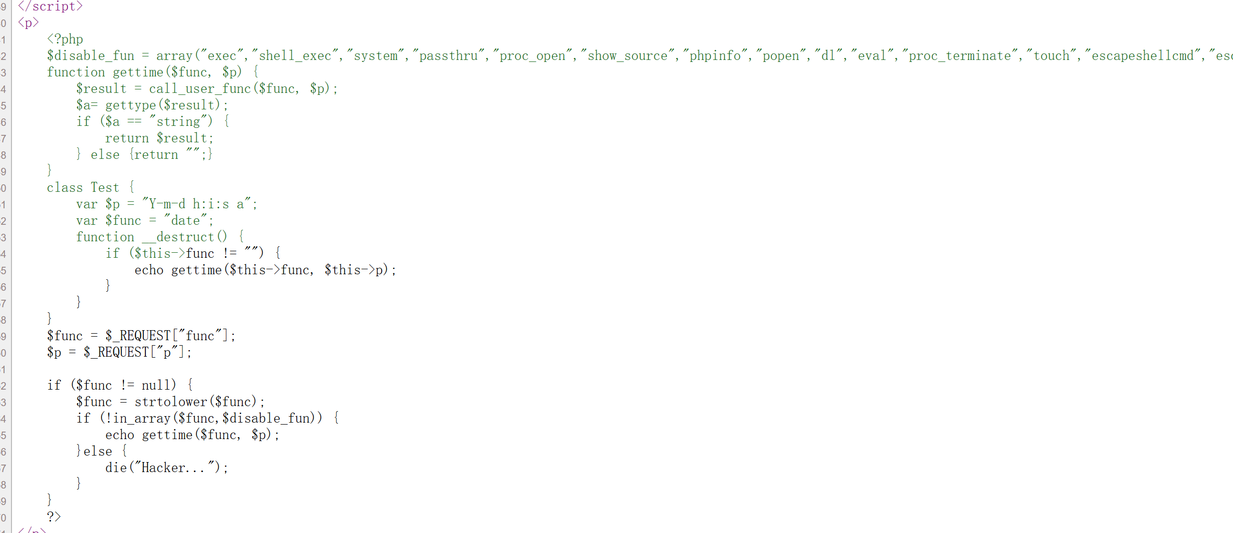 if ($func != null) { $func = strtolower($func); if (!in_array($func,$disable_fun)) { echo gettime($func, $p); }else { die("Hacker..."); } } ?>