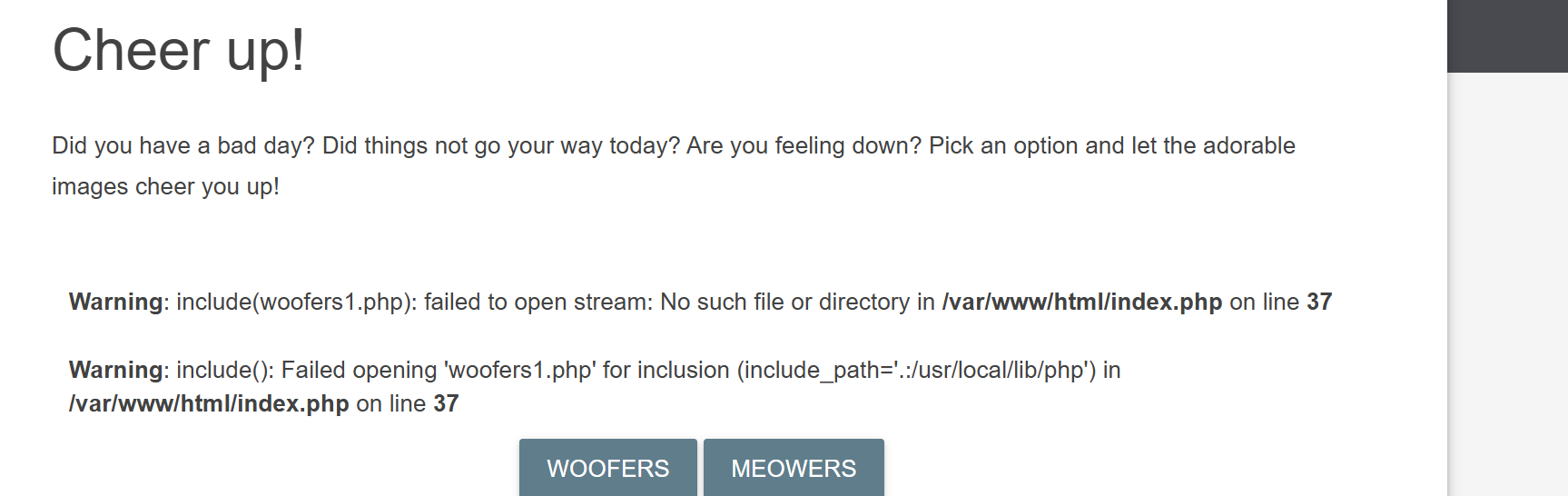 Warning: include(): Failed opening 'woofers1.php' for inclusion (include_path='.:/usr/local/lib/php') in /var/www/html/index.php on line 37