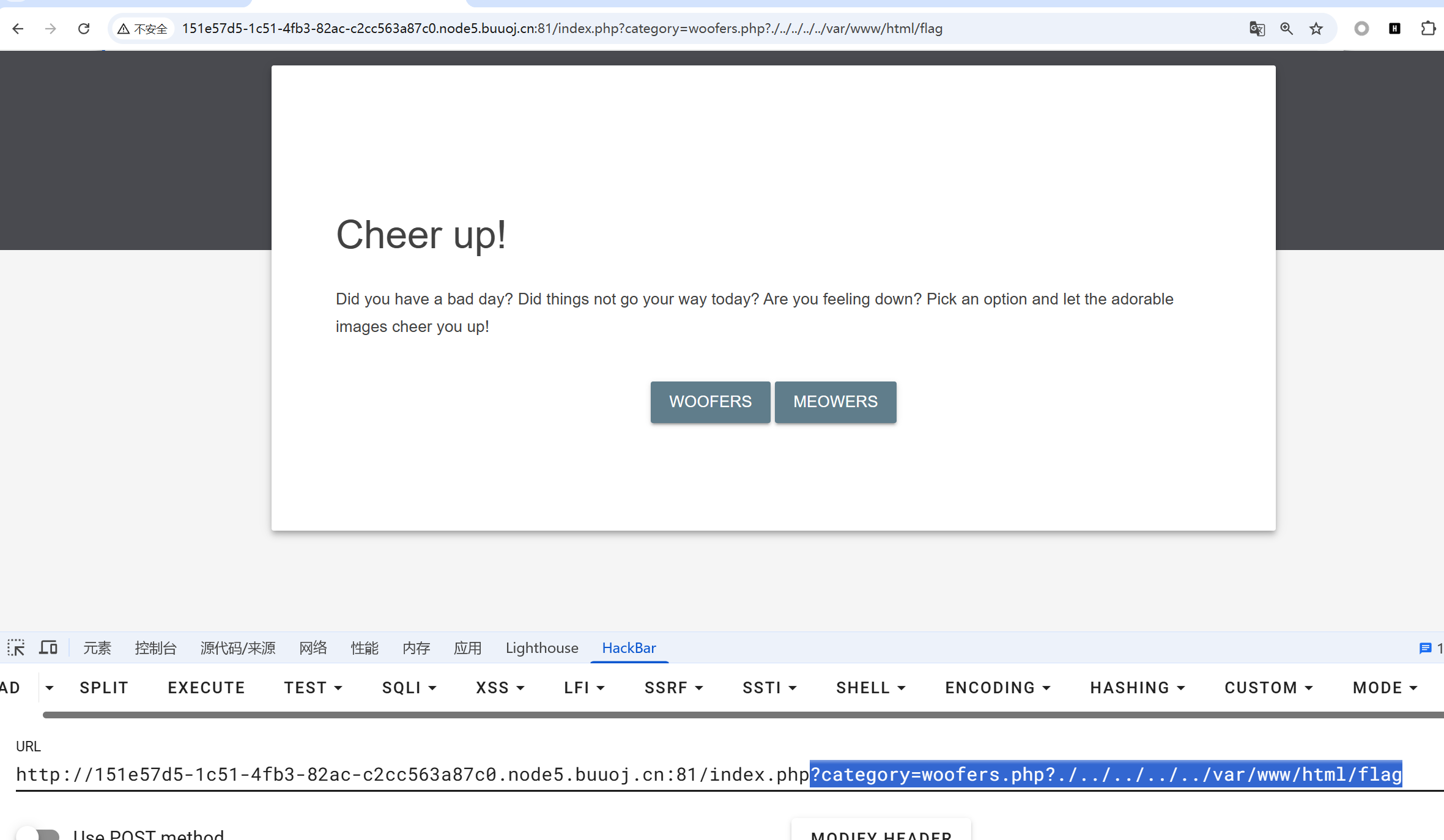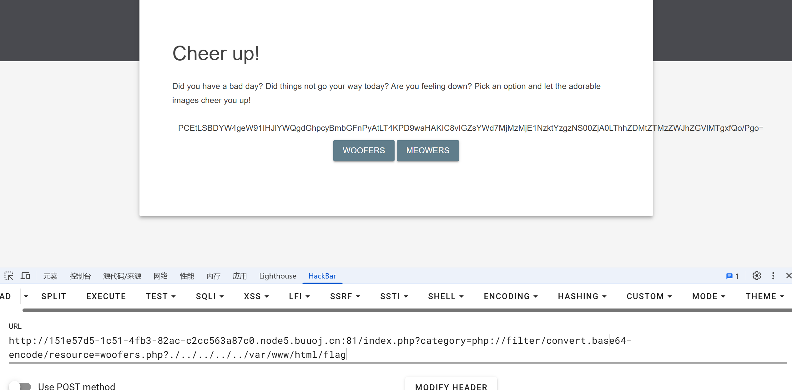 这里看了下网上的payload:说是get传入的参数不包含”woofers”、“meowers”、“index”则会跳转到else,所以无法直接读取,必须在变量中插入”woofers”、“meowers”、“index”,在filter伪协议中添加无效路径index即可,而且好像不需要目录穿越,也不需要用include特性