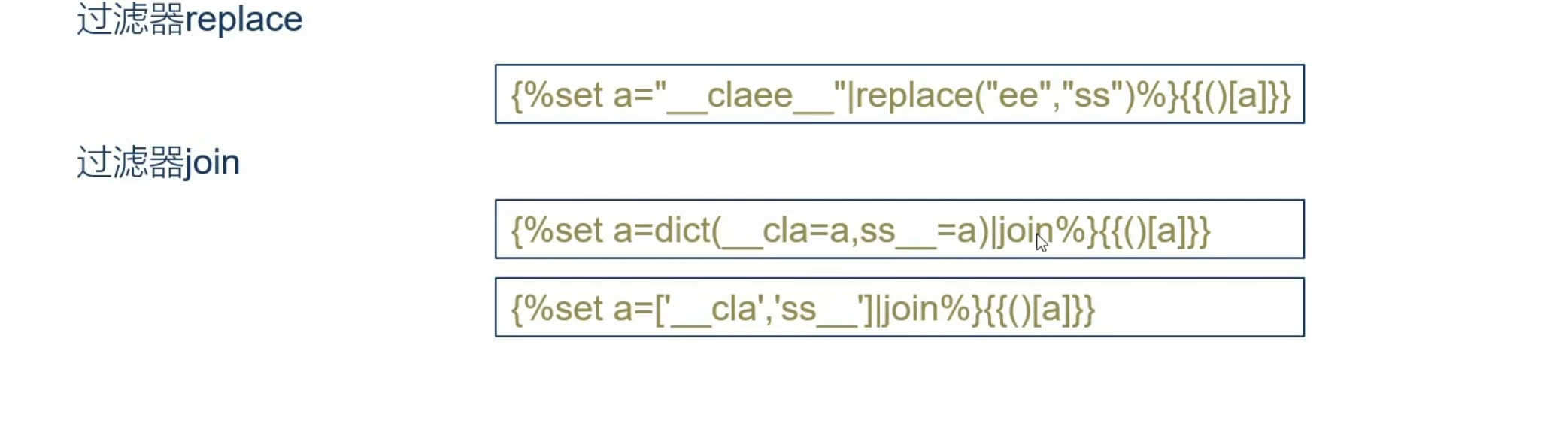 1 2 {% set a=dict(__cla=1 ,ss=2 )| join %} {{a}} 使用join拼接出字符串"__class__"