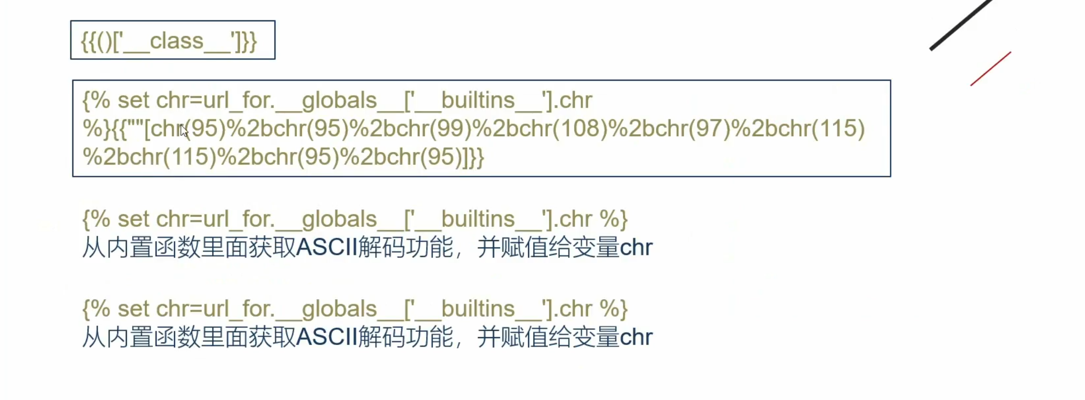 1 2 3 4 5 6 7 {% set ben= ({}|select()|string()) %} {{ben}} #获取下划线 {% set ben = (self|string()) %} {{ben}} #获取空格 {% set ben = (self|string|urlencode ) %} {{ben}} #获取百分号 {% set ben = (app.__doc__|string) %} {{ben}}
