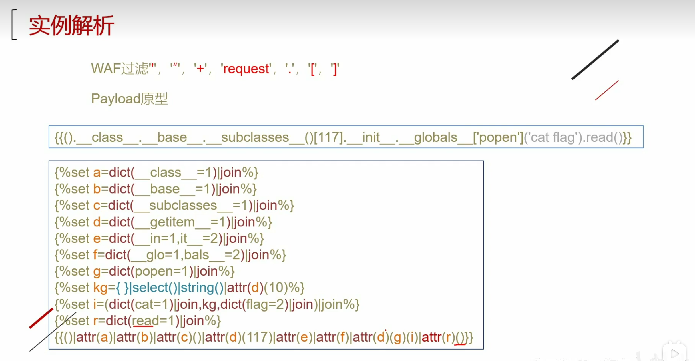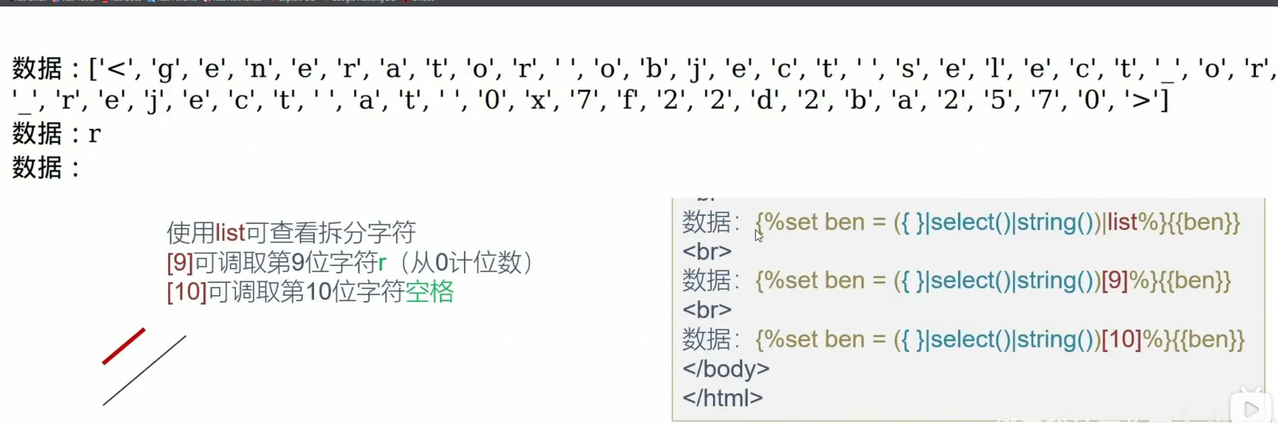 实例解析1 1 **用 {% set kg={}| select()| string()| attr(d)(10 )%} 得到空格**