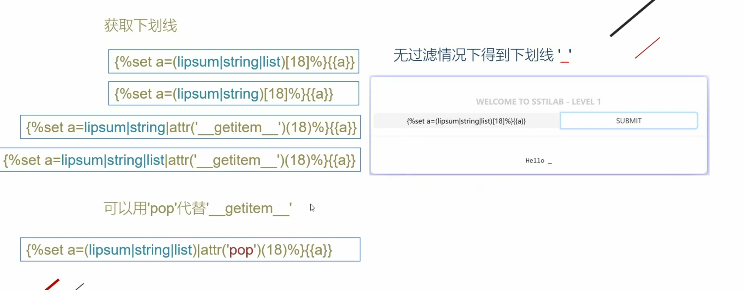 实例解析2(WAF过滤’’’,’”‘,’_’,’.’,’[‘,’]’,’ ‘) 1 使用 {{lipsum |string|list}} 获取符号