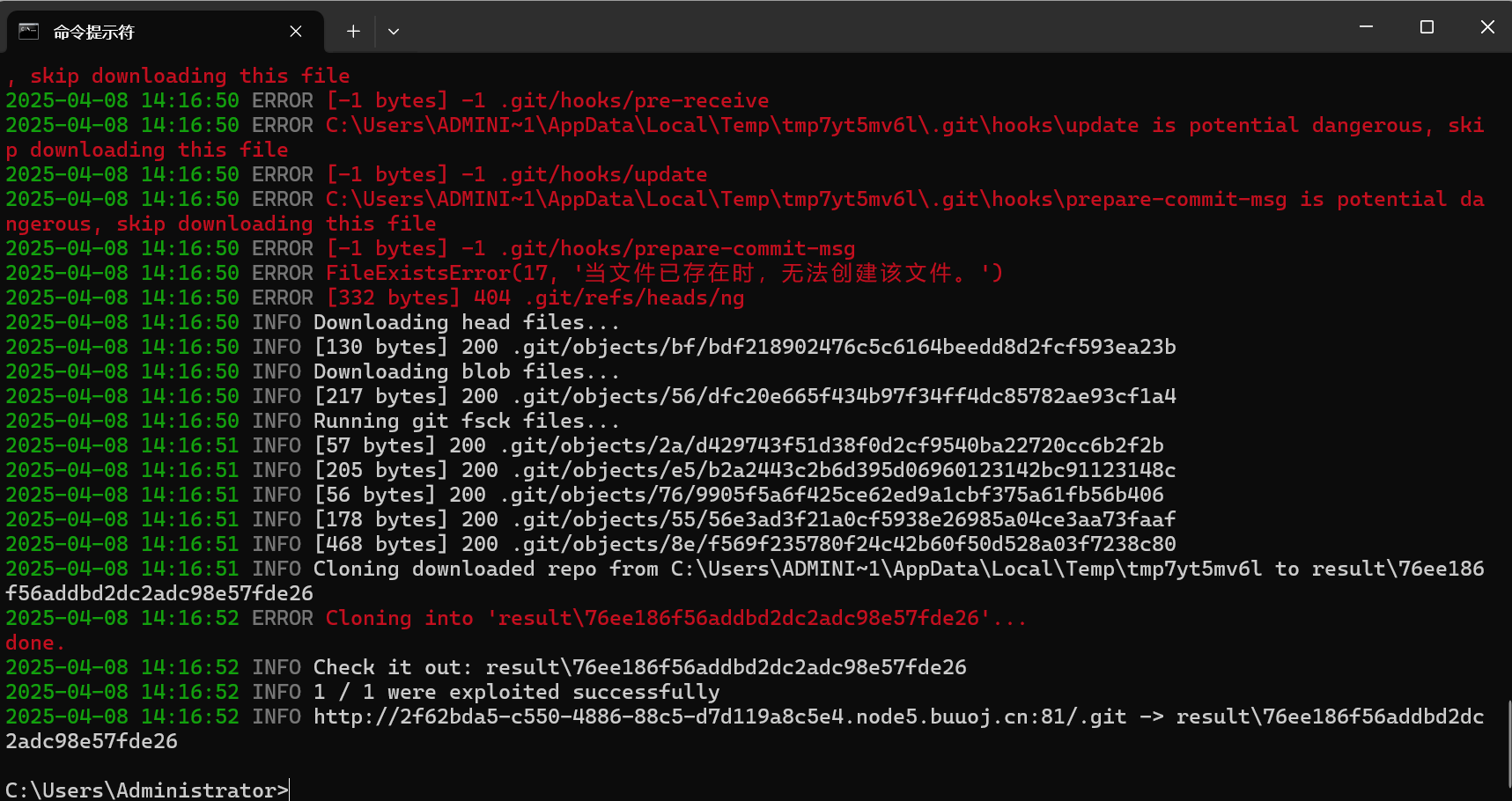 1 githacker --url http://2 f62bda5-c550-4886 -88 c5-d7d119a8c5e4.node5.buuoj.cn:81 /.git --output-folder result
