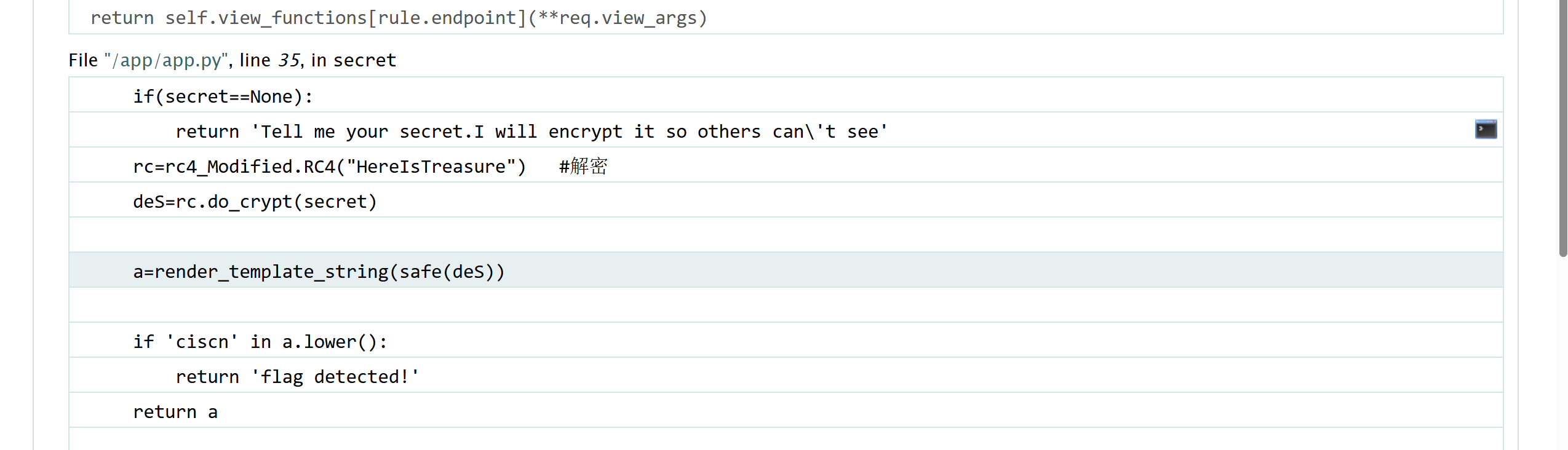 def secret(): if(secret==None): return 'Tell me your secret.I will encrypt it so others can\'t see' rc = rc4_Modified.RC4("HereIsTreasure") deS = rc.do_crypt(secret) a = render_template_string(safe(deS)) if 'ciscn' in a.lower(): return 'flag detected!' return a
