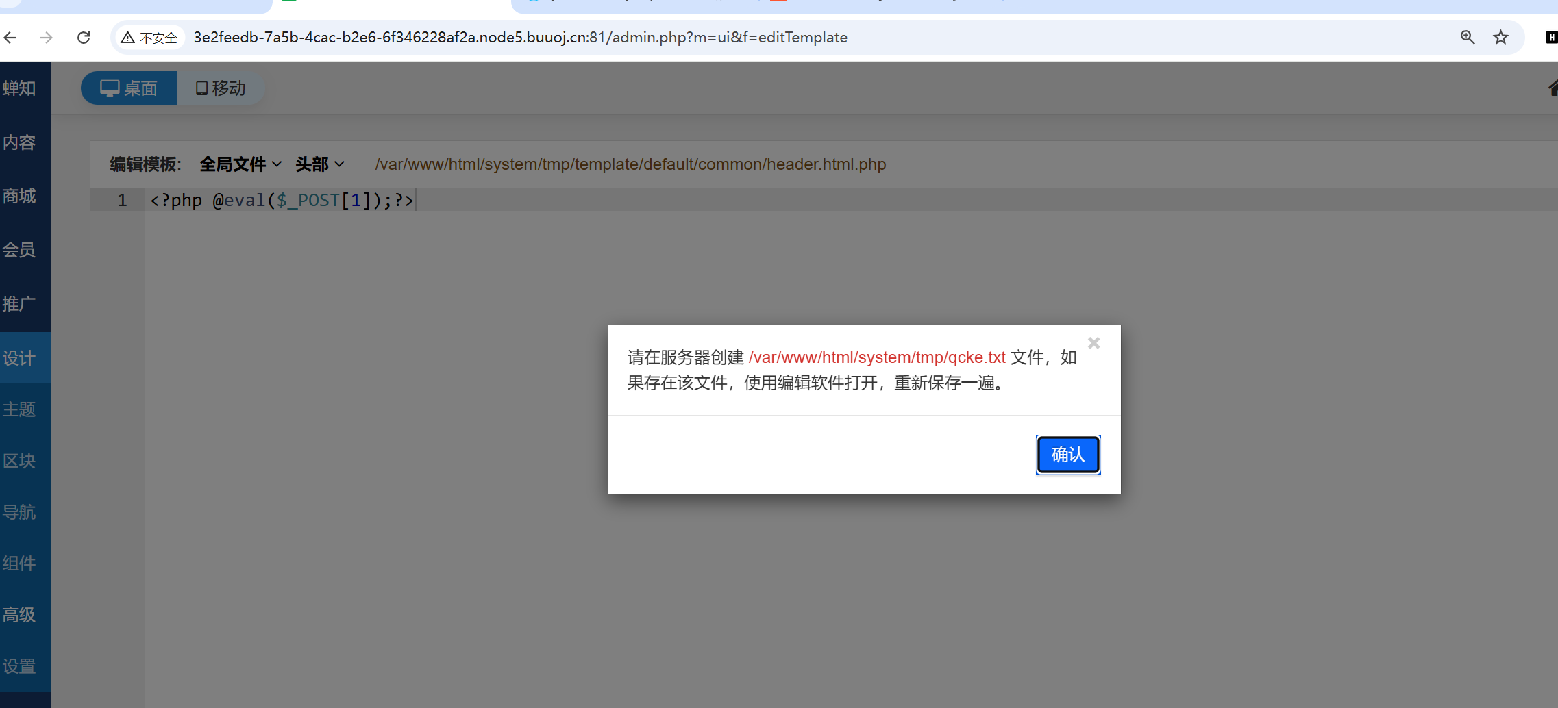 显示请在服务器创建/var/www/html/system/tmp/qcke.txt文件。但是这里我们没有找到这个文件